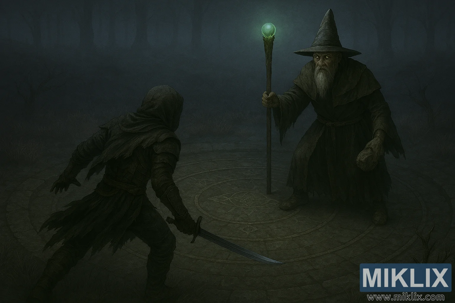 আলোর ধরণটি মনোমুগ্ধকর এবং সিনেমাটিক, ধূসর, নীল এবং নিঃশব্দ সবুজ রঙের শীতল সুর দ্বারা প্রাধান্য পেয়েছে। লাঠির সবুজ আভা এবং ছোরার ঠান্ডা আভা বিপরীত হাইলাইট প্রদান করে। ছায়াগুলি নরম এবং ছড়িয়ে ছিটিয়ে থাকে, কুয়াশার মধ্যে মিশে যায়, যখন সূক্ষ্ম হাইলাইটগুলি বর্ম, কাপড় এবং পাথরের টেক্সচারকে জোর দেয়। উঁচু কোণ স্থানিক সচেতনতা বৃদ্ধি করে, যা দর্শককে এভারগোলের সম্পূর্ণ বিন্যাস এবং চরিত্রগুলির গতিশীল অবস্থান উপলব্ধি করতে দেয়।