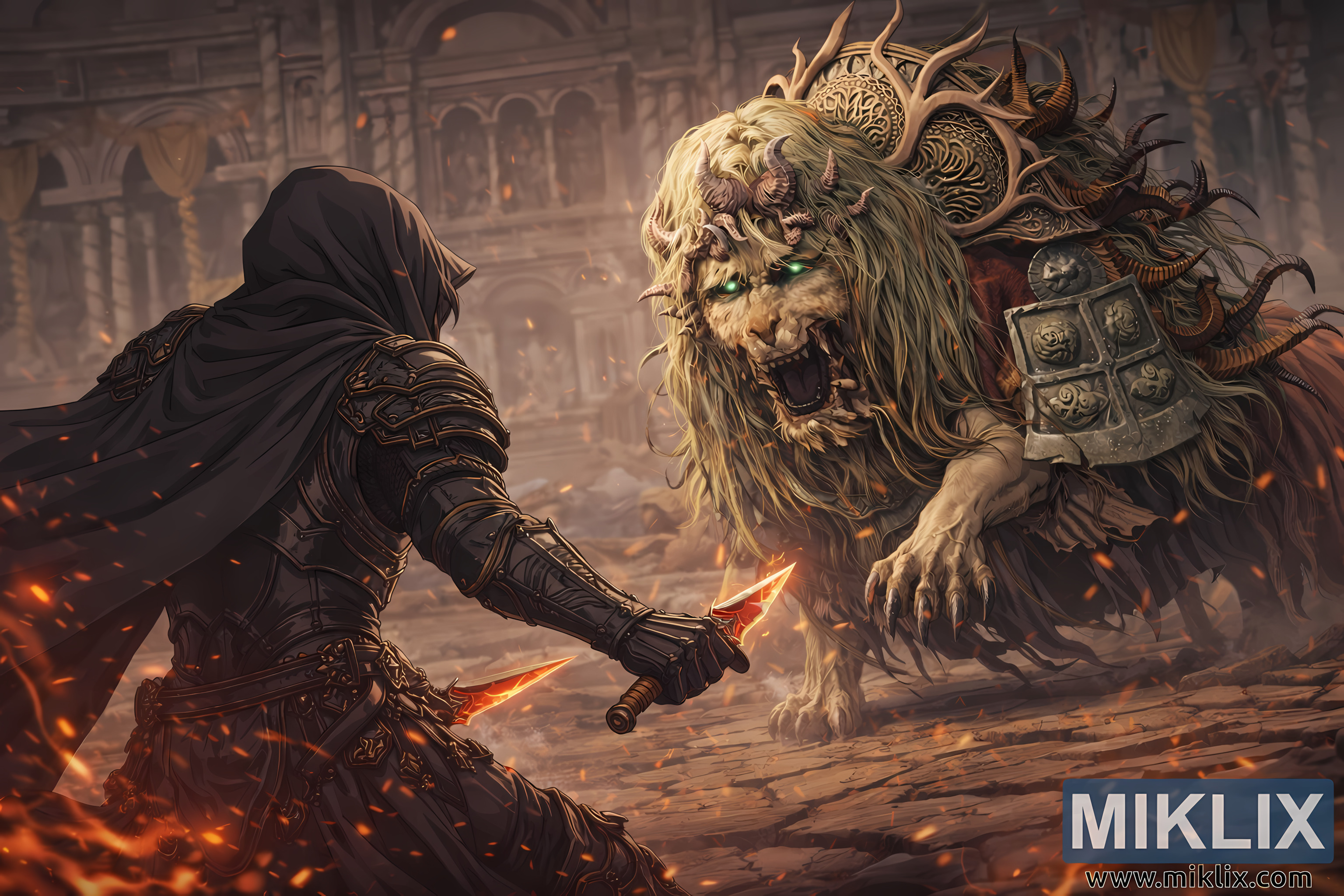 উচ্চ-রেজোলিউশনের অ্যানিমে ফ্যান আর্ট যেখানে কালো ছুরি বর্ম পরা কলঙ্কিত ব্যক্তি জ্বলন্ত স্ফুলিঙ্গ এবং প্রাচীন এলডেন রিং ধ্বংসাবশেষের মধ্যে ডিভাইন বিস্ট ড্যান্সিং লায়ন-এর সাথে লড়াই করছে।