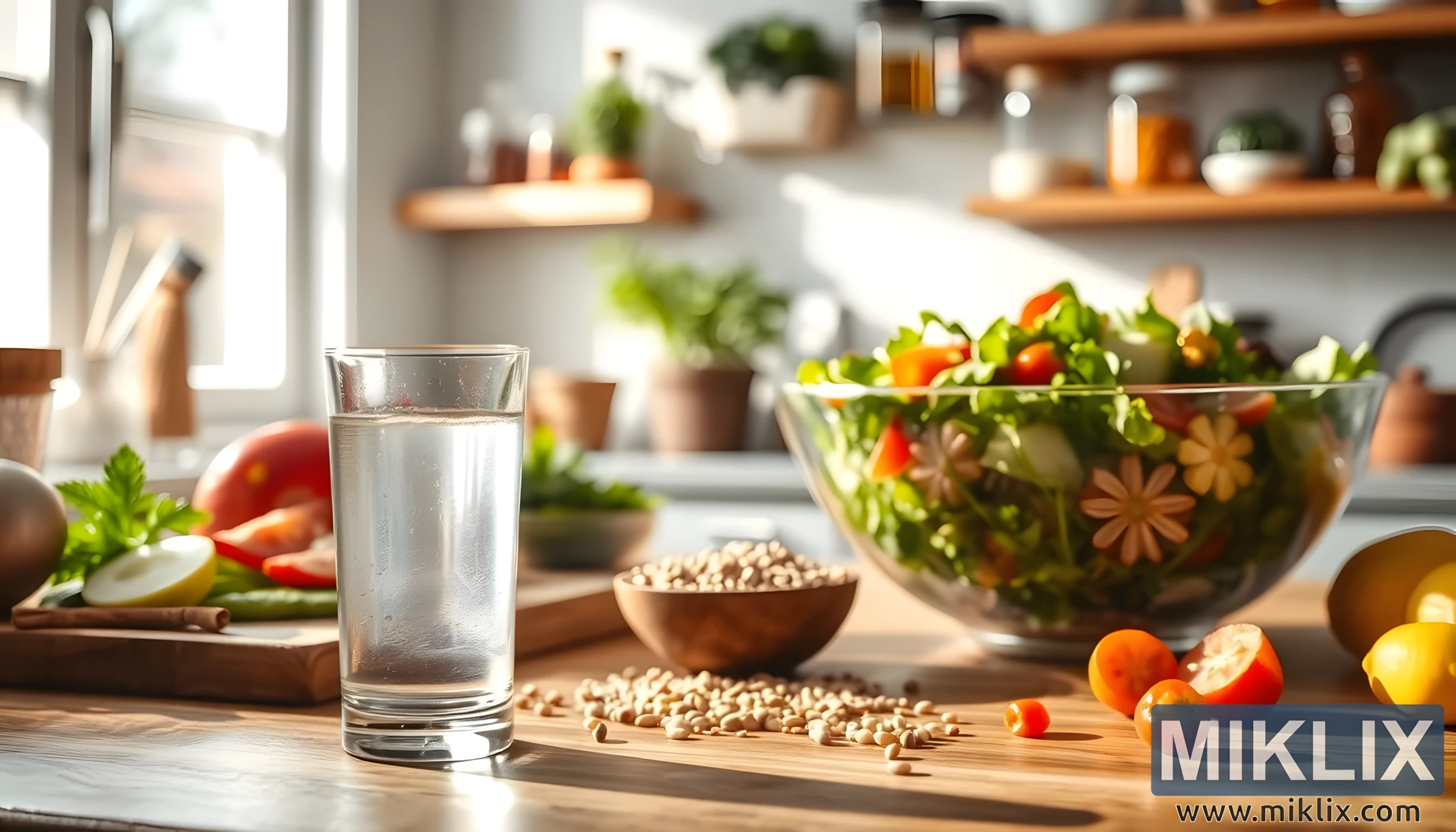 গ্লুকোম্যানান পানীয়, তাজা শাকসবজি, শস্য এবং সালাদ সহ সূর্যালোকিত রান্নাঘরের দৃশ্য, যা স্বাস্থ্যকর খাবারে এর বহুমুখীতা এবং উপকারিতা তুলে ধরে।