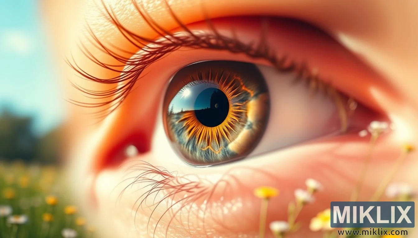 পটভূমিতে, একটি তৃণভূমির অস্পষ্ট রূপরেখা বাইরের দিকে প্রসারিত, যা স্পষ্টভাবে সংজ্ঞায়িত চোখের সাথে একটি শান্ত বৈপরীত্য প্রদান করে। সবুজ পাতাগুলি ছোট, সূক্ষ্ম ফুলের সাথে মিশে আছে - সাদা, হলুদ এবং গোলাপী - প্রতিটি ফ্যাকাশে নীল আকাশের নীচে মৃদুভাবে আলোকিত। তৃণভূমির প্রাকৃতিক প্যালেট এবং নরম ফোকাস শান্ত, প্রাণশক্তি এবং প্রকৃতির পুনরুদ্ধারকারী শক্তির উদ্রেক করে, একই সাথে চোখের স্বাস্থ্য এবং প্রাকৃতিক জগতের সামঞ্জস্যের মধ্যে একটি প্রতীকী সংযোগও তৈরি করে। এই সংমিশ্রণ দর্শককে মনে করিয়ে দেয় যে মানুষের সুস্থতা পরিবেশের সাথে গভীরভাবে জড়িত, এবং প্রাকৃতিক উৎস থেকে প্রাপ্ত পুষ্টি - তা বায়ু, সূর্যালোক বা খাদ্যের মাধ্যমেই হোক না কেন - কেবল শরীরকেই নয়, দৃষ্টির স্বচ্ছতাকেও সমর্থন করে।