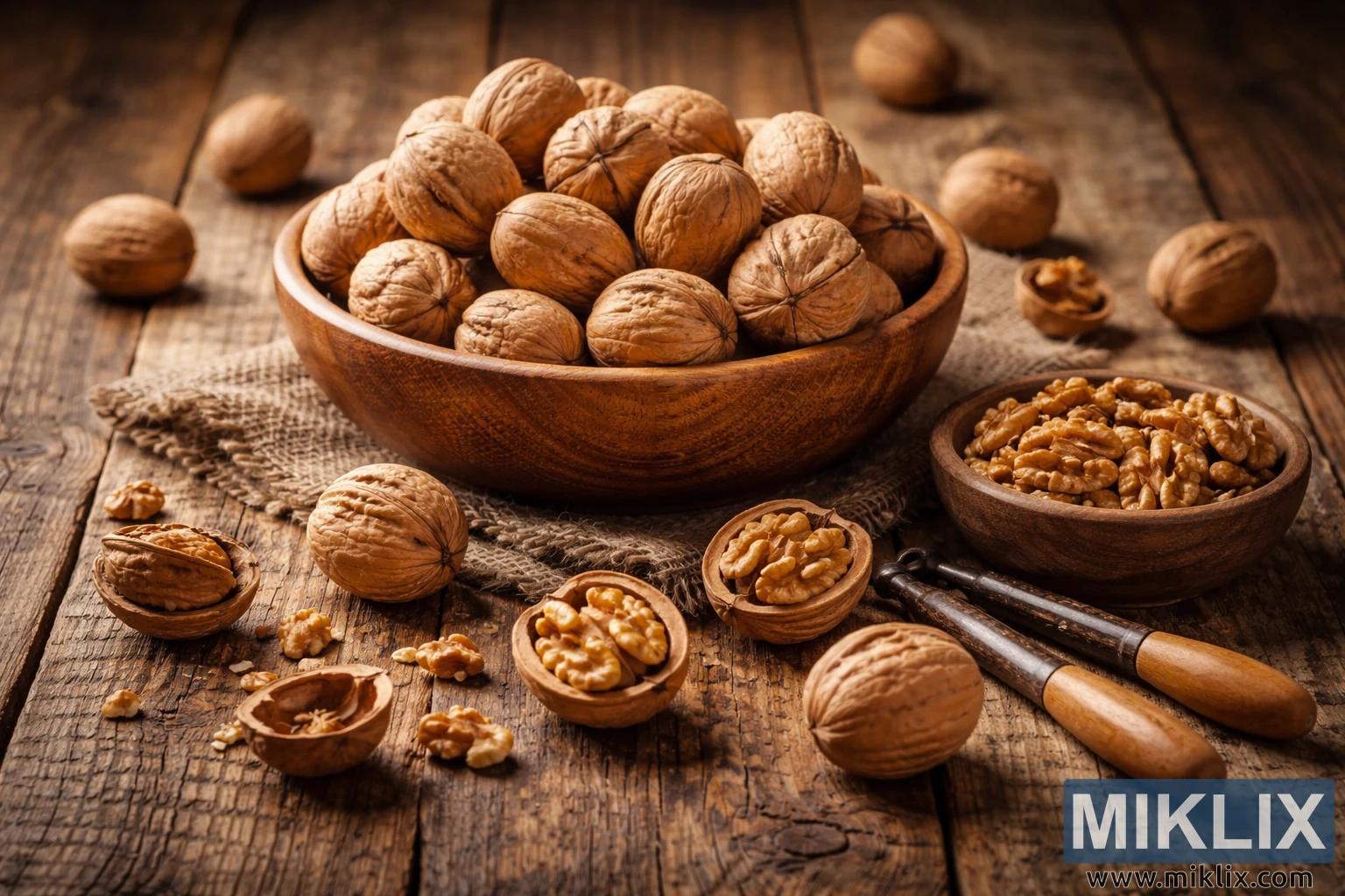 একটি উষ্ণ আলোকিত স্থির জীবনের ছবিতে একটি গ্রাম্য কাঠের টেবিলের উপর আখরোটের উদার বিন্যাস দেখানো হয়েছে, যা একটি ঐতিহ্যবাহী ফার্মহাউস রান্নাঘরের পরিবেশকে জাগিয়ে তোলে। দৃশ্যের কেন্দ্রে একটি বৃহৎ, গোলাকার কাঠের বাটি রয়েছে যা কানায় কানায় পূর্ণ, পুরো আখরোট দিয়ে ভরা, তাদের খাঁজকাটা খোলস ফ্যাকাশে তাজা বাদামি থেকে গাঢ় মধু বাদামী রঙের। বাটিটি একটি রুক্ষ বার্লাপ কাপড়ের উপর স্থির যা একটি নরম, তন্তুযুক্ত জমিন যোগ করে এবং খাবারকে নীচের ক্ষয়প্রাপ্ত তক্তা থেকে সূক্ষ্মভাবে আলাদা করে। মূল বাটির চারপাশে, পৃথক আখরোট প্রাকৃতিকভাবে ছড়িয়ে ছিটিয়ে থাকে, কিছু অক্ষত থাকে এবং অন্যগুলি তাদের জটিল, সোনালী অভ্যন্তর প্রকাশ করার জন্য খোলা থাকে। অগ্রভাগে, বেশ কয়েকটি আখরোটের খোসা পরিষ্কারভাবে অর্ধেক ভাগ করা হয়, ছোট ছোট প্রাকৃতিক কাপ তৈরি করে যা মস্তিষ্কের মতো কর্নেলগুলিকে আবদ্ধ করে। কর্নেলগুলি তাজা এবং চকচকে দেখায়, উষ্ণ আলো ধরে এবং খোসার ম্যাট পৃষ্ঠের সাথে বিপরীত হাইলাইট তৈরি করে।