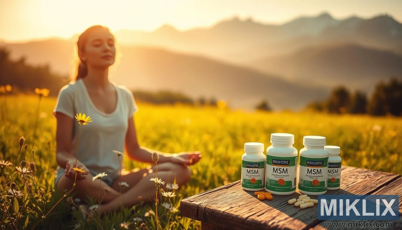 ধ্যানরত ব্যক্তি এবং MSM সম্পূরক সহ একটি শান্তিপূর্ণ তৃণভূমির দৃশ্য, যা প্রাকৃতিক সম্প্রীতি এবং অ্যালার্জি উপশম এবং সুস্থতায় MSM-এর ভূমিকার প্রতীক।