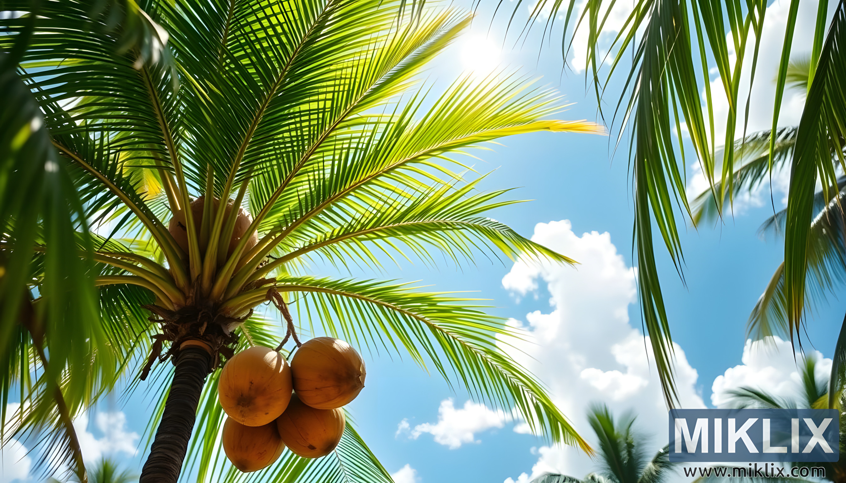 গ্রীষ্মমন্ডলীয় দৃশ্য, যেখানে একটি নারকেল গাছ, পাকা নারকেল এবং একটি উজ্জ্বল নীল আকাশ রয়েছে, যা প্রশান্তি, প্রাকৃতিক দান এবং নারকেলের সুস্থতার সুবিধার প্রতীক।