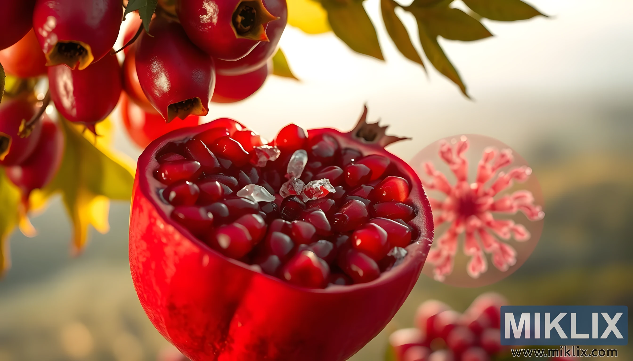 কেন্দ্রীয় ফলের উপরে এবং চারপাশে, ছোট, অক্ষত ডালিমের গুচ্ছগুলি তাদের পাতাযুক্ত কাণ্ড থেকে ঝুলছে, যা দৃশ্যটিকে তার প্রাকৃতিক পরিবেশে ভিত্তি করে তুলেছে। তাদের ঘন লাল খোসা উজ্জ্বল সবুজ পাতার সাথে সুন্দরভাবে বৈপরীত্য করে, যা পিছন থেকে আলতো করে সূর্যের আলো দ্বারা আলোকিত হয়। রচনার এই উপাদানটি প্রাচুর্য এবং ধারাবাহিকতার অনুভূতি জাগিয়ে তোলে, যেন একক খোলা ডালিম প্রকৃতির উদারতার একটি উদাহরণ, যা ফলের ভারে ভরা একটি সমৃদ্ধ গাছ থেকে আঁকা। পটভূমিটি ঘূর্ণায়মান পাহাড় এবং দূরবর্তী আলোর একটি নরম, স্বর্গীয় ভূদৃশ্যে উন্মোচিত হয়, যা নিঃশব্দ সুরে উপস্থাপন করা হয় যা দর্শকের মনোযোগ ফলের উপর রাখে কিন্তু একই সাথে স্বাস্থ্য, বৃদ্ধি এবং পৃথিবীর সাথে সংযোগের একটি বৃহত্তর, সামগ্রিক প্রেক্ষাপটের ইঙ্গিত দেয়।