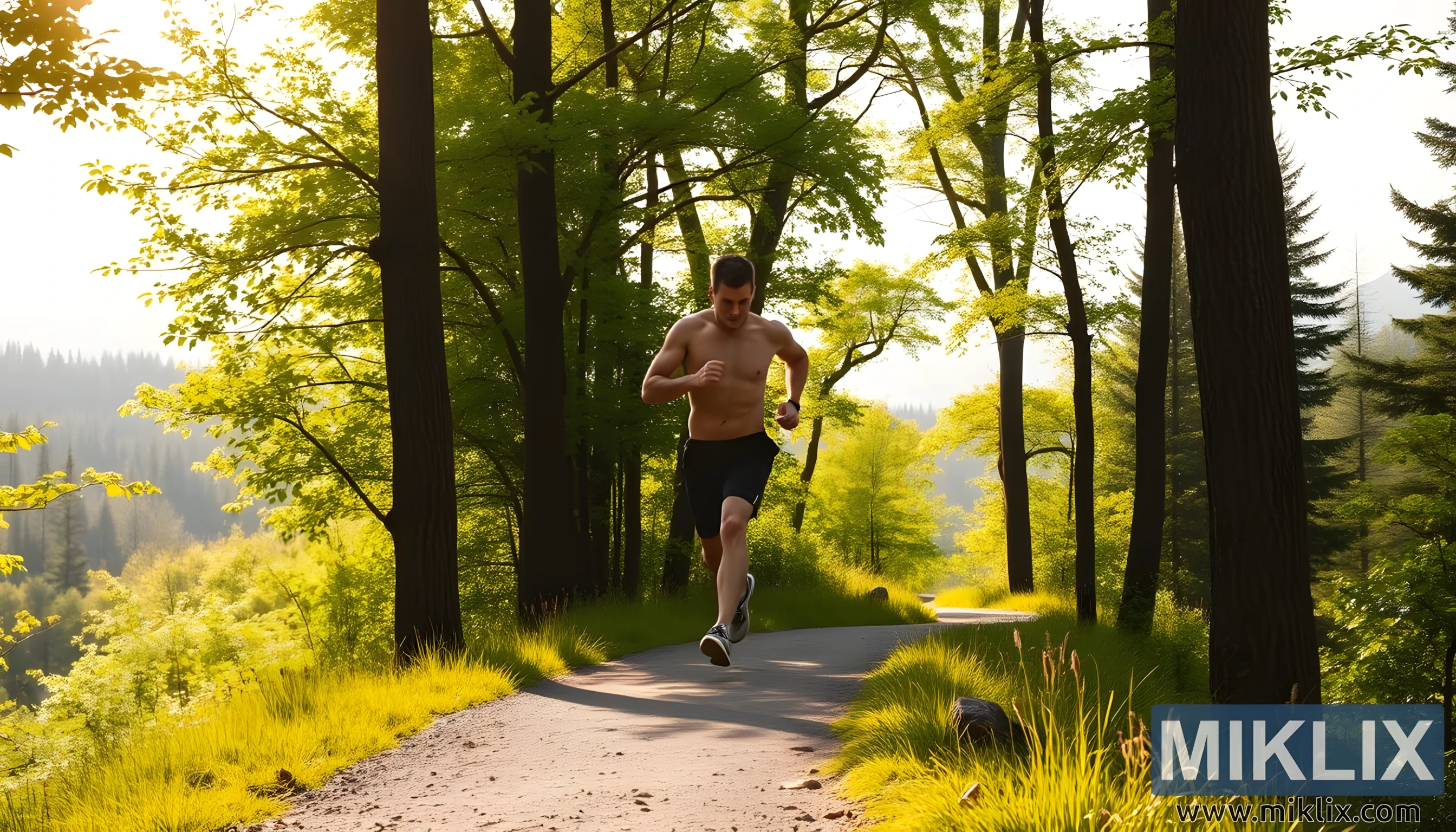 ছবিটিতে সূর্যালোকিত বনের পথের পটভূমিতে নড়াচড়া এবং প্রাণশক্তির এক অসাধারণ মুহূর্ত ধরা পড়েছে, যা দূর থেকে মৃদু বাতাসে ভেসে আসা একটি সূর্যালোকিত বনের পথের পটভূমিতে অবস্থিত। ছবির কেন্দ্রবিন্দুতে, একজন ফিট, শার্টবিহীন দৌড়বিদ দৃঢ় সংকল্পের সাথে এগিয়ে চলেছেন, তার পেশীবহুল দেহ পরিশ্রম এবং শক্তিতে টানটান। তার আকৃতি সোজা, তার পদক্ষেপ শক্তিশালী কিন্তু তরল, যা কেবল শারীরিক সক্ষমতাই নয় বরং তার চারপাশের প্রাকৃতিক পরিবেশের সাথে স্বাচ্ছন্দ্য এবং সামঞ্জস্যের ইঙ্গিত দেয়। প্রতিটি নড়াচড়া সকাল বা শেষ বিকেলের সূর্যের উষ্ণ, সোনালী রশ্মি দ্বারা স্পষ্ট হয়ে ওঠে, যা উপরের ছাউনি ভেদ করে বনের মেঝেতে ছড়িয়ে পড়ে, দৌড়বিদটির ত্বক এবং তার অনুসরণ করা পথ উভয়কেই আচ্ছন্ন করে। আলো দৃশ্যপট জুড়ে একটি নরম আভা ছড়িয়ে দেয়, পাতা এবং ঘাসের সবুজ, প্রাণবন্ত সবুজের উপর জোর দেয়, একই সাথে সমগ্র ভূদৃশ্যে একটি স্বপ্নের মতো পরিবেশ তৈরি করে।