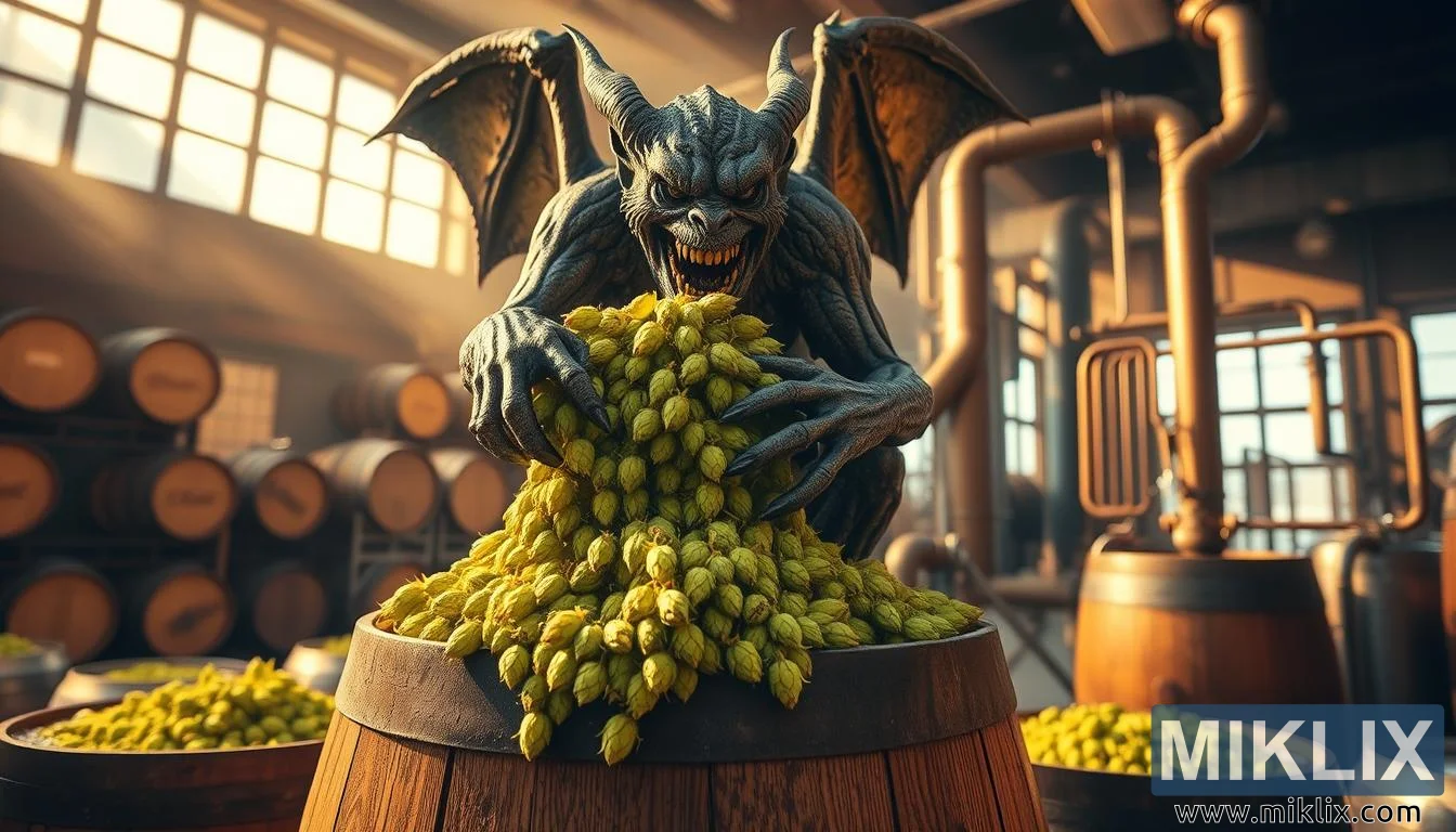 এই চিত্রটি একটি ব্যস্ত মদ্যপানের কারখানার দেয়ালের মধ্যে একটি আকর্ষণীয় এবং অবাস্তব দৃশ্য উপস্থাপন করে, যা পৌরাণিক কাহিনী এবং কারুশিল্পের জগৎকে একটি অবিস্মরণীয় সারণীতে মিশ্রিত করে। রচনার কেন্দ্রে একটি গার্গয়েল বসে আছে, এর রূপ ভয়ঙ্কর এবং মহিমান্বিত, তাজা হপসে ভরা একটি বৃহৎ কাঠের ব্যারেলের উপরে ঝুলে আছে। গভীর খাঁজ এবং ঢাল দিয়ে খোদাই করা এর পাথর-ধূসর দেহটি প্রায় জীবন্ত বলে মনে হয় যখন লম্বা জানালা দিয়ে সোনালী আলো প্রবাহিত হয়, প্রাণীটির তীক্ষ্ণ, খাঁজকাটা বৈশিষ্ট্যগুলিকে আলোকিত করে। এর পিছনে প্রসারিত ডানাগুলি, অন্ধকার, চামড়ার পালের মতো, এমনভাবে আভা ধরে যা তাদের ভারী এবং অশুভ উভয়ই দেখায়। গার্গয়েলের মুখটি দাঁতযুক্ত হাসিতে বিকৃত, দুষ্টুমি এবং ভয়ের মিশ্রণ, যখন এর লম্বা, নখরযুক্ত হাতগুলি লোভের সাথে এর নীচে হপসের ঢিবিতে আঁকড়ে ধরে। সবুজ শঙ্কুগুলি প্রচুর পরিমাণে ঢেকে যায়, ব্যারেলের পাশ দিয়ে সবুজ জীবনের বন্যায় ছড়িয়ে পড়ে যা গার্গয়েলের রুক্ষ, উদ্বিগ্ন রূপের সাথে স্পষ্টভাবে বৈপরীত্য করে।