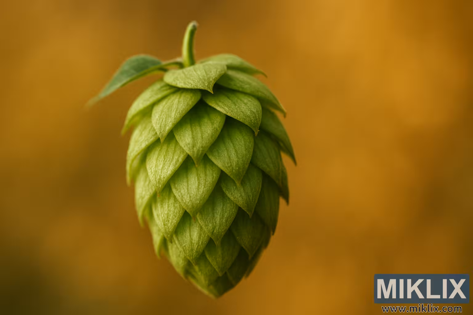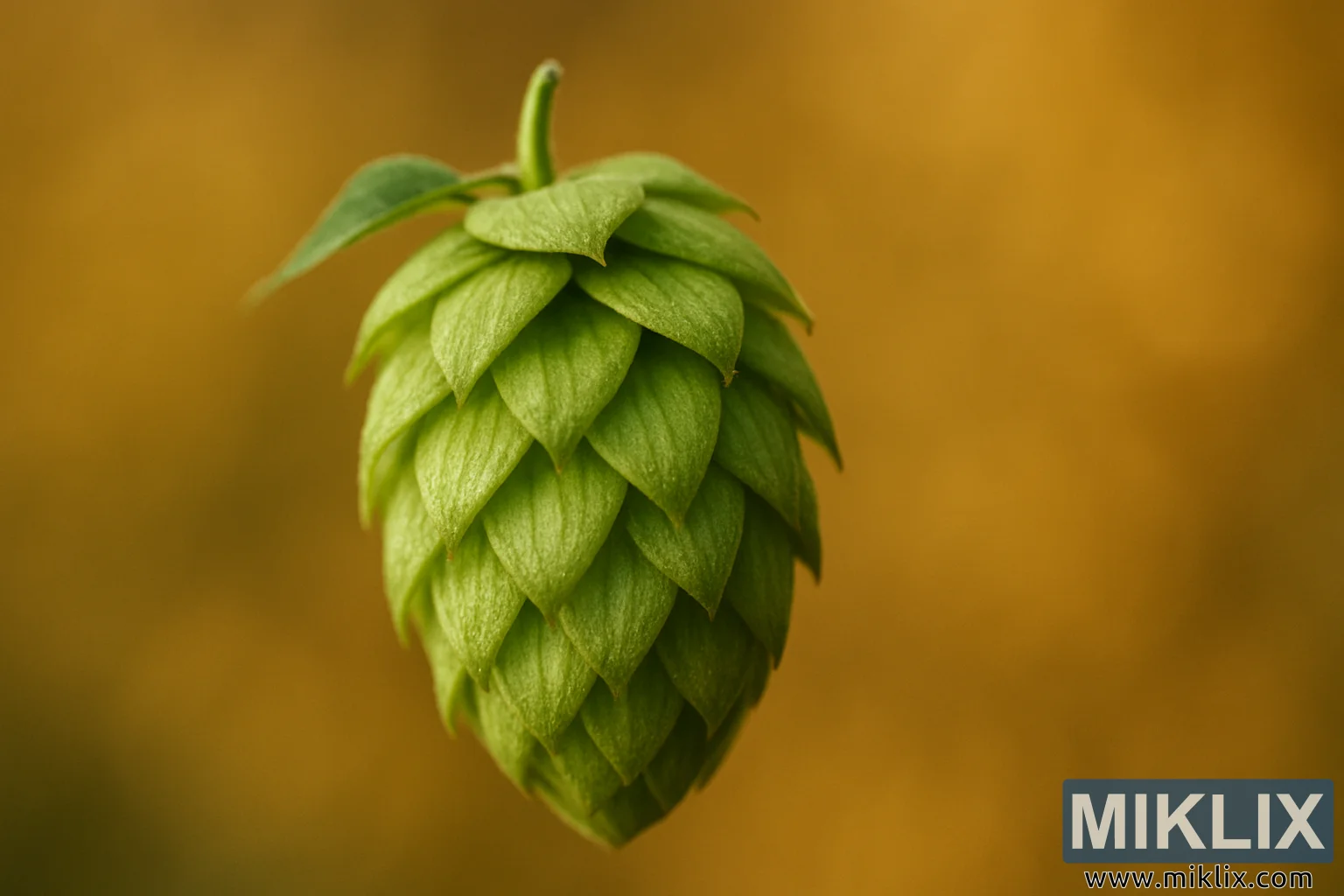 ছবিটিতে একটি একক ল্যান্ডহফেন হপ শঙ্কুকে চিত্রিত করা হয়েছে - হিউমুলাস লুপুলাসের একটি অপূর্ব নমুনা - একটি মৃদু ঝাপসা সোনালী পটভূমির বিপরীতে শান্ত বিচ্ছিন্নতায় ঝুলন্ত। একটি ভূদৃশ্য রচনায় ধারণ করা, ছবিটি সূক্ষ্ম বিশদ এবং শ্রদ্ধাশীল সরলতার একটি গবেষণা, যা ঐতিহ্যবাহী ইউরোপীয় হপ চাষের গ্রামীণ আকর্ষণ এবং শিল্পকর্মের সারাংশকে মূর্ত করে তুলেছে। শঙ্কুটি একমাত্র বিষয় হিসাবে ফ্রেমে প্রাধান্য পেয়েছে, এর মার্জিত রূপটি তীক্ষ্ণ ফোকাসে উপস্থাপন করা হয়েছে যখন এর পিছনের সবকিছু উষ্ণ অ্যাম্বার রঙের ক্রিমি ধোয়ায় মিশে গেছে যা বয়স্ক মাল্ট বা গ্রীষ্মের শেষের দিকের সূর্যালোকের মতো পাকা জমিতে স্মরণ করিয়ে দেয়।