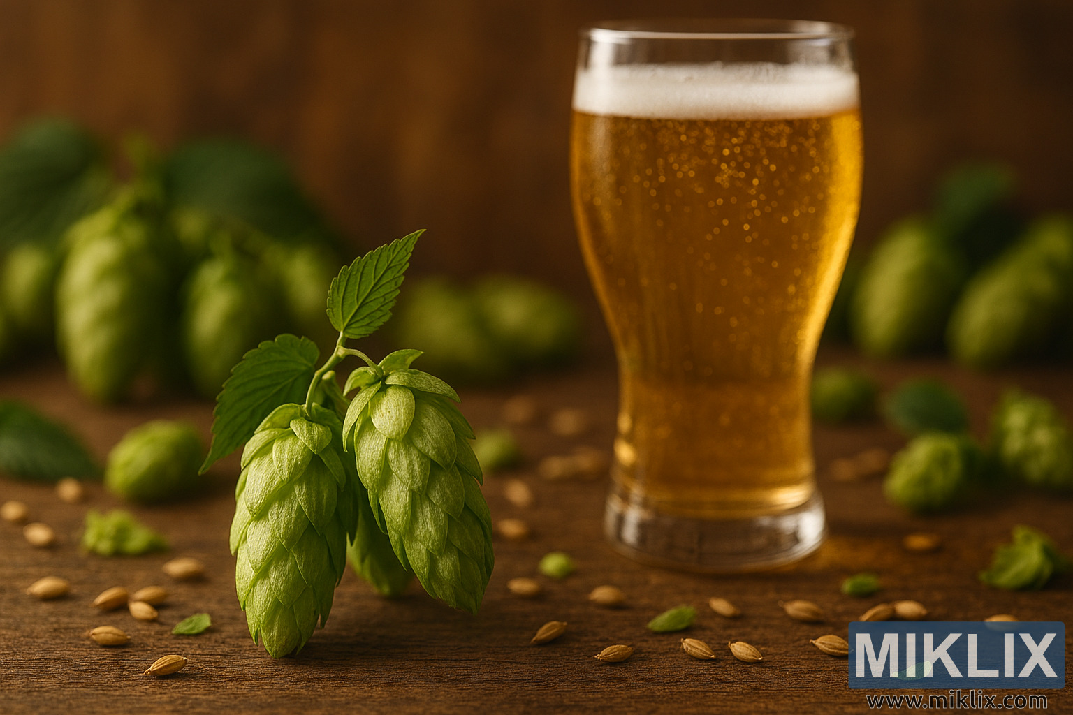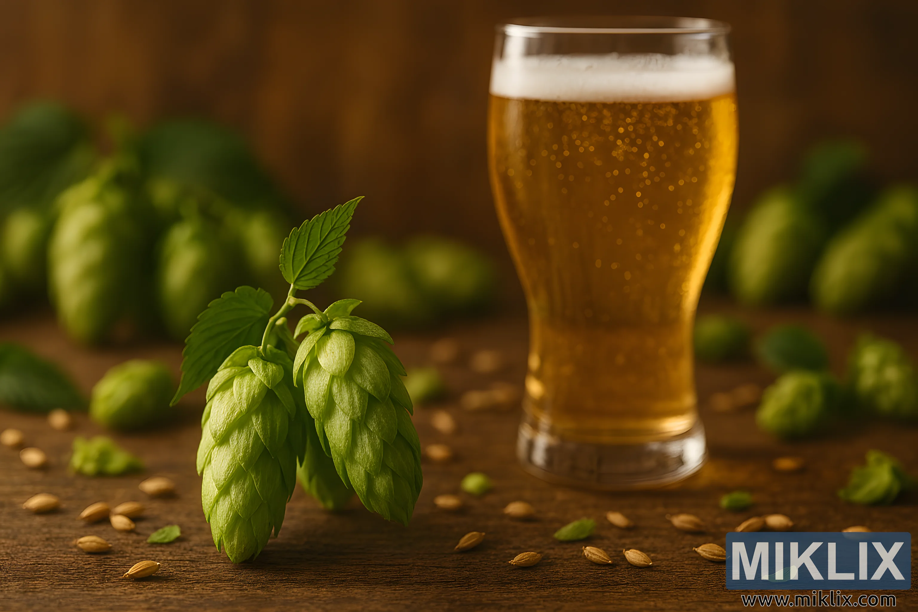 একটি উষ্ণ, উচ্চ-রেজোলিউশনের ছবিতে একটি গ্রাম্য টেবিলে স্ট্রিসেলসপাল্ট হপস এবং সোনালী বিয়ার দেখানো হয়েছে, যা মদ্যপানের শিল্পকে উদযাপন করছে।