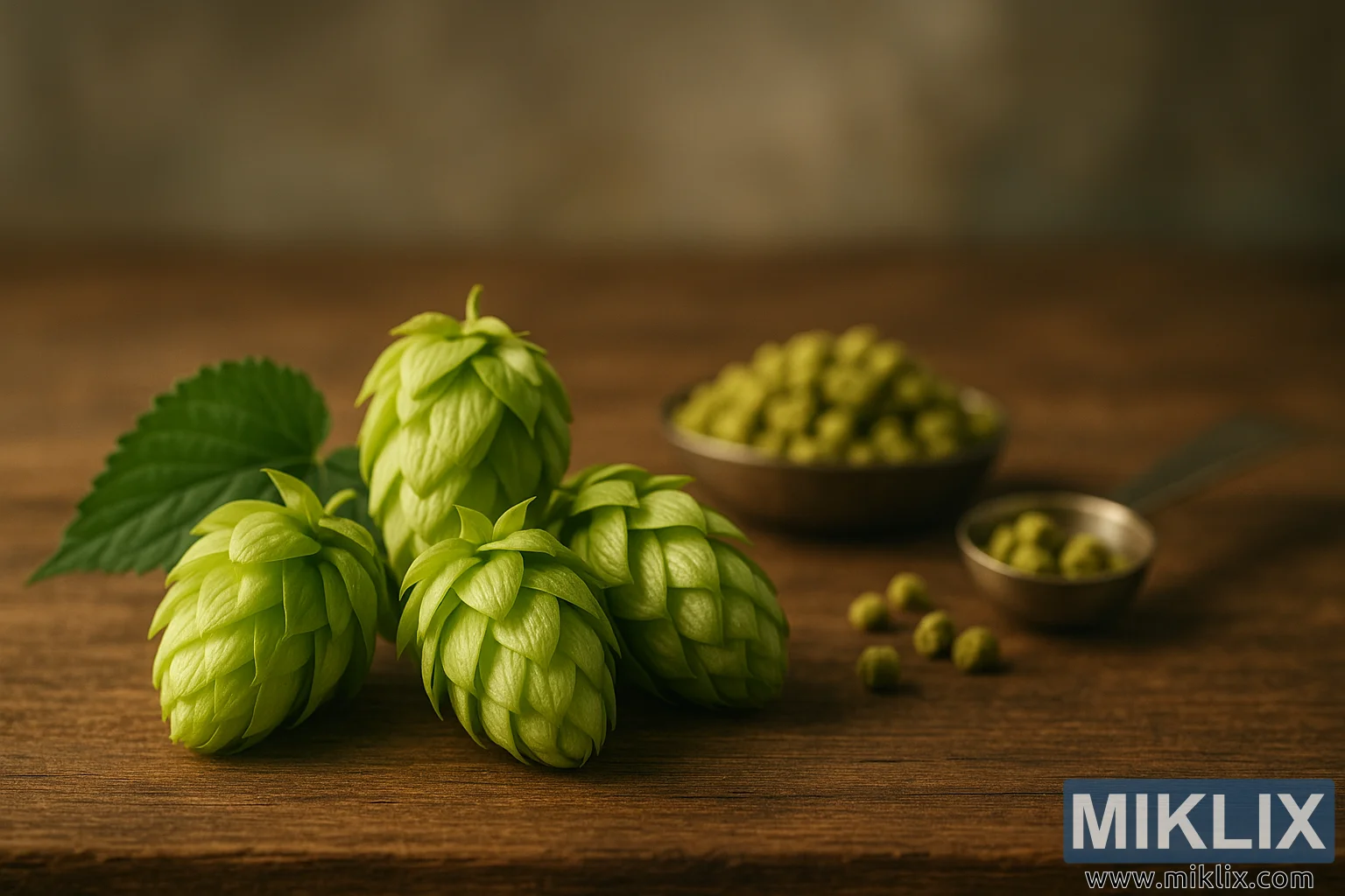 উষ্ণ, নরম আলোর নিচে চামচ এবং হপ পেলেটের বাটির পাশে কাঠের উপর তাজা টয়োমিডোরি হপ শঙ্কু দেখানো একটি শান্ত স্থির জীবন।