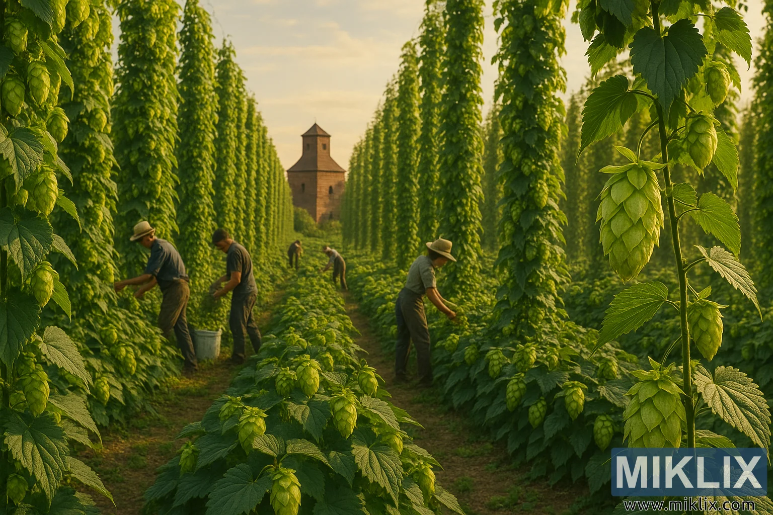 সূর্যালোকিত জেনিথ হপ ক্ষেত, যেখানে কৃষকরা সুগন্ধি শঙ্কু সংগ্রহ করছেন, সবুজ লতা দিয়ে ঘেরা এবং হপ চাষের ঐতিহ্যের প্রতীক একটি ঐতিহাসিক ভাটি।
