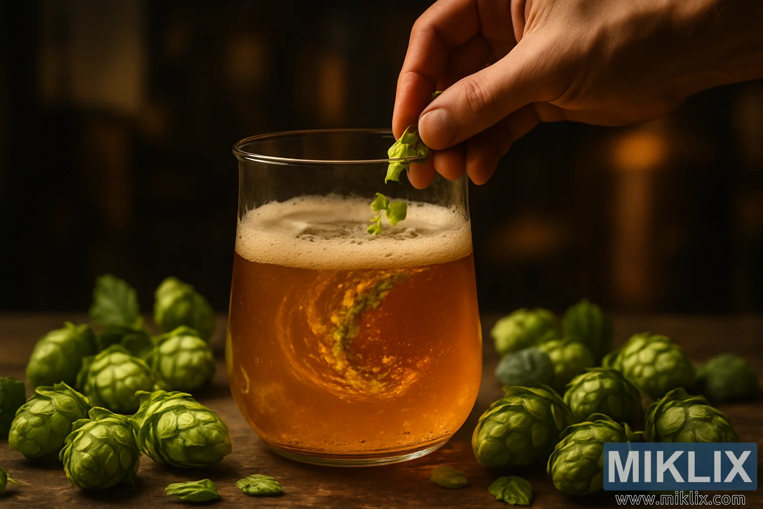 ছবিটিতে মদ্যপানের এক মুহূর্ত ধরা পড়েছে যা অন্তরঙ্গ এবং বৈজ্ঞানিক উভয় অনুভূতিরই অনুভূতি দেয়, ঐতিহ্যে নিমজ্জিত কিন্তু পরীক্ষা-নিরীক্ষার মাধ্যমে জীবন্ত। রচনাটির কেন্দ্রবিন্দুতে সোনালী পশম দিয়ে ভরা একটি কাচের পাত্র রয়েছে, যার পৃষ্ঠটি ফেনার একটি পাতলা স্তর দিয়ে মুকুটযুক্ত যা কিনারায় লেগে থাকে। উষ্ণ আলোতে তরলটি জ্বলজ্বল করে, অ্যাম্বার এবং মধুর সুরে ঝলমল করে, যা সমৃদ্ধি এবং গভীরতার ইঙ্গিত দেয়। কাচের মধ্যে, একটি ঘূর্ণি আলোড়িত হয় যখন একজন ব্রিউয়ারের হাত থেকে জেনিথ হপসের একটি তাজা চিমটি সূক্ষ্মভাবে ফেলে দেওয়া হয়, যা একটি ঘূর্ণি তৈরি করে যা সুগন্ধের মতোই দৃষ্টিনন্দন। ছবিতে গতি স্থির হয়ে যায়, প্রকৃতি এবং কারুশিল্পের ছেদ করার ঠিক মুহূর্তটি ধরে রাখে - সেই মুহূর্তটি যখন হপের রেজিন, তেল এবং লুপুলিন গ্রন্থি তাদের রূপান্তরমূলক কাজ শুরু করে।