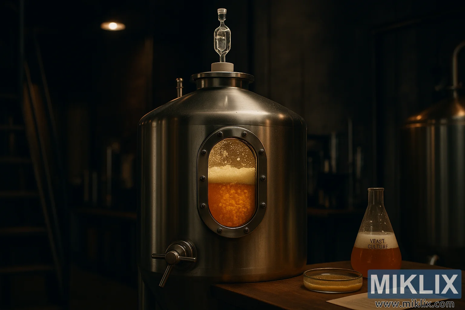 ছবিটি দর্শকদের একটি কর্মক্ষম ব্রুয়ারির নিস্তেজ পরিবেশে ডুবিয়ে দেয়, এর মৃদু আলো স্টেইনলেস স্টিলের ঝলমলে এবং বিয়ারের গাঁজনে প্রাণবন্ত আভায় বিদ্ধ। কেন্দ্রে একটি বৃহৎ নলাকার স্টেইনলেস স্টিলের গাঁজনকারী, পালিশ করা কিন্তু ব্যবহারের দ্বারা সামান্য চিহ্নিত, এর শিল্প দৃঢ়তা অসংখ্য ব্রিউইং চক্রের প্রমাণ। ট্যাঙ্কটির সবচেয়ে মনোমুগ্ধকর বৈশিষ্ট্য হল ডিম্বাকৃতির কাচের জানালাটি এর বাঁকা দেয়ালে দৃঢ়ভাবে স্থাপন করা হয়েছে, নির্ভুলতার সাথে বোল্ট করা হয়েছে এবং ভিতরের গোপন জগতের একটি বিরল আভাস প্রদান করে। কাচের পিছনে, একটি আমেরিকান-শৈলীর অ্যাল সক্রিয় গাঁজনকারীর মাঝখানে রয়েছে।