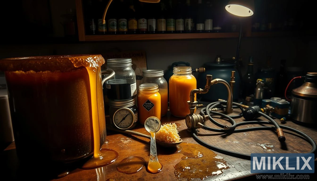 This image doesn’t merely depict a brewing accident—it tells a story of passion, imperfection, and the delicate balance between craft and chaos. It invites the viewer to reflect on the nature of experimentation, the inevitability of mistakes, and the beauty that can still be found in moments of failure. The spilled honey, the broken tools, and the cluttered workspace all converge to create a visual metaphor for the messy, unpredictable journey of creation.