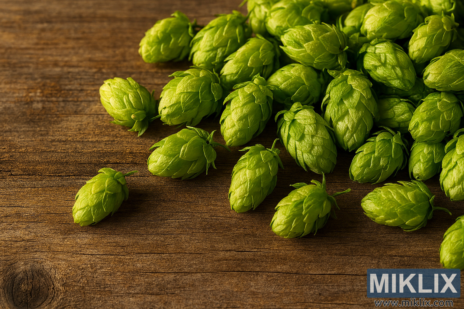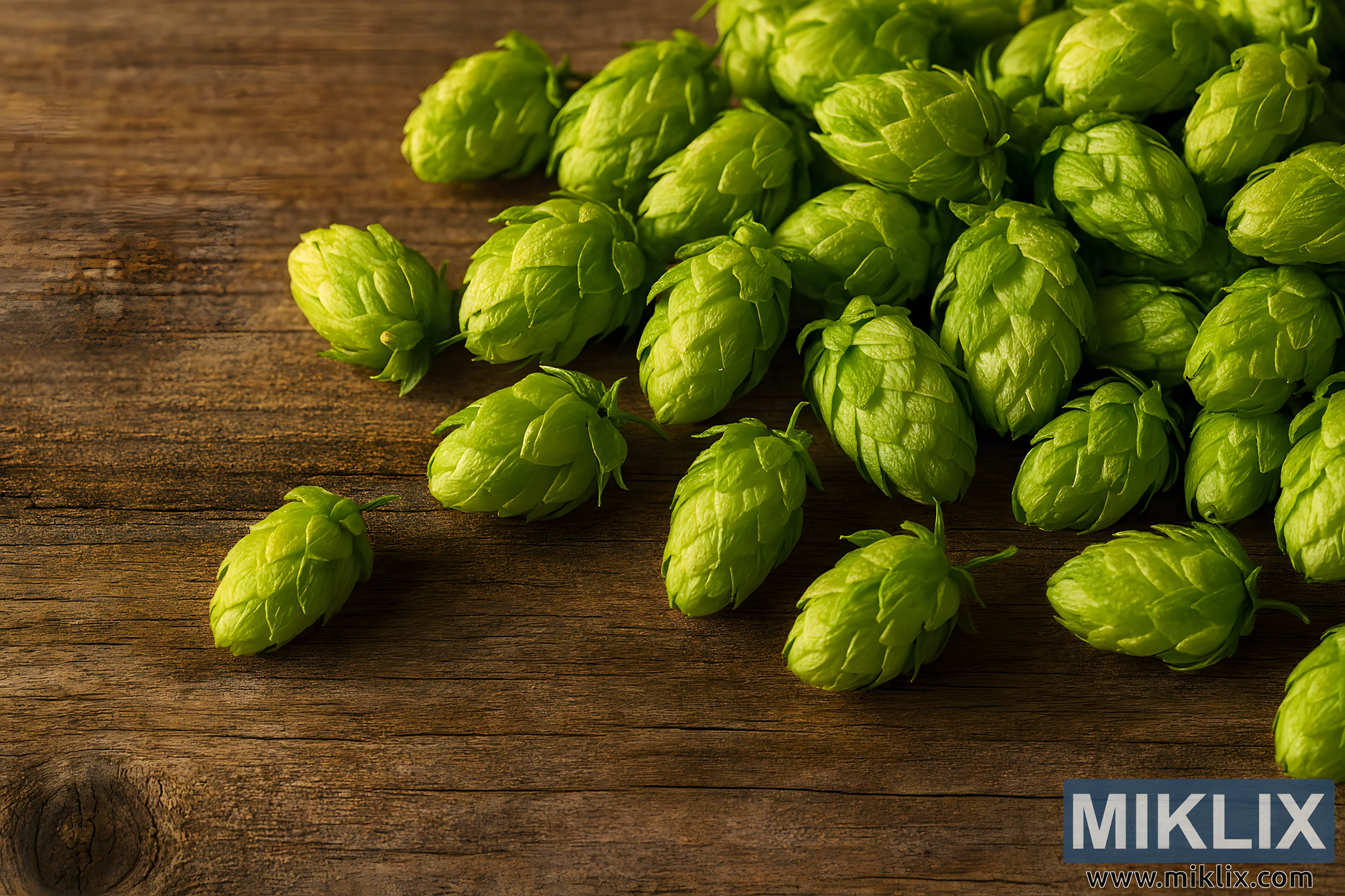 Image: Fresh African Queen hop cones on a rustic wooden table