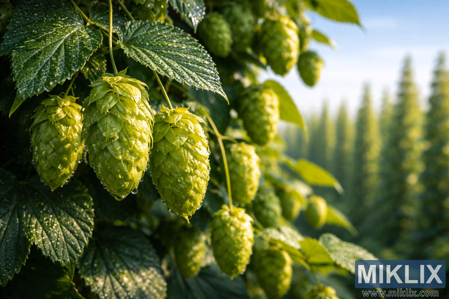 A high-resolution landscape photograph capturing dewy Ahtanum hop cones in warm morning sunlight, with trailing vines and a softly blurred hop field beneath a clear blue sky.