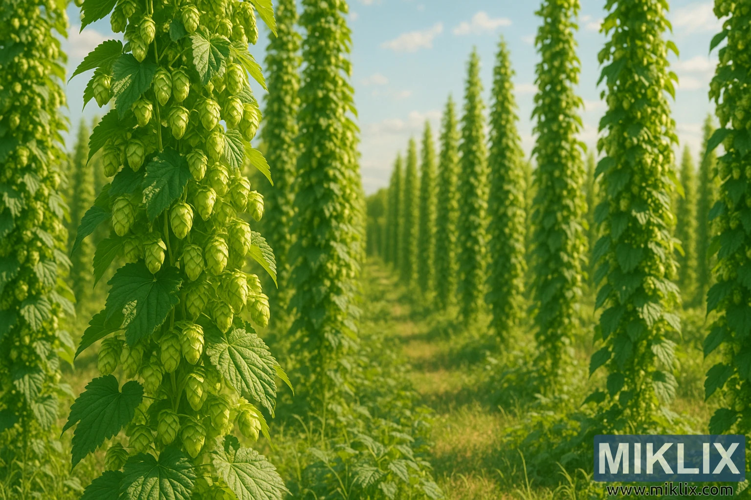 Overall, the scene balances order and wildness, human labor and natural growth, practicality and beauty. It conveys abundance, vitality, and the tranquil joy of summer in the countryside. The image is as much about the sensory experience — the imagined scent of resinous hops, the feel of warm sunlight, the rustling of leaves in a faint breeze — as it is about what is seen. It is an immersive portrait of a hops field at its most lush and radiant, a vision of nature harnessed and celebrated in the form of vertical green towers reaching toward the sky.