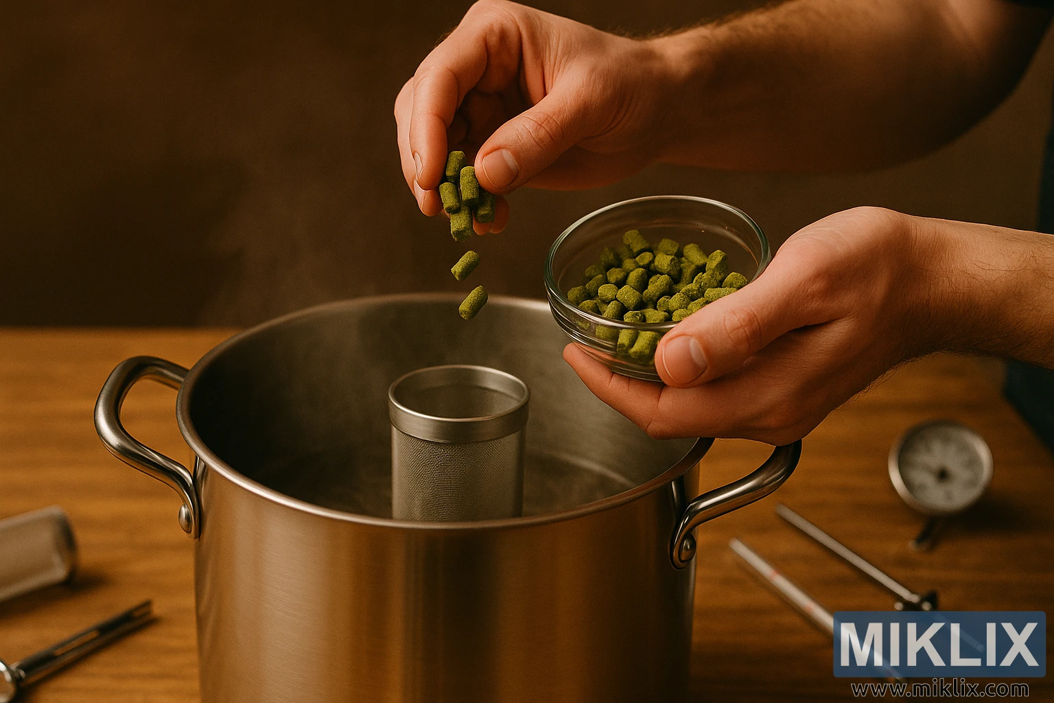 Close-up of a brewer’s hands adding Aramis hop pellets into a steaming stainless kettle, capturing care, warmth, and craft in brewing.
