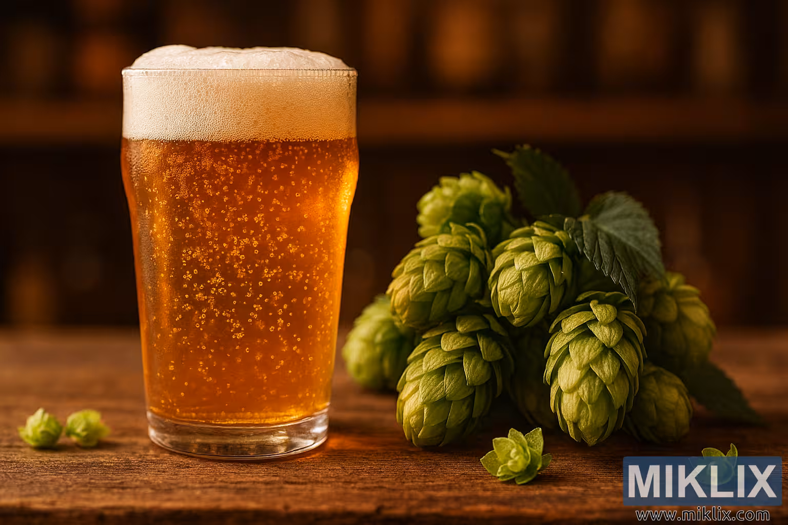 The middle ground features a softly blurred backdrop of a rustic wooden bar. Horizontal wooden planks in warm, earthy tones evoke the ambiance of a cozy brewery or pub. The wood grain is subtly visible, contributing to the authenticity and tactile richness of the setting. The lighting is diffused and ambient, casting a gentle golden glow across the beer, hops, and wooden surface. This soft illumination enhances the natural colors and textures, creating a sense of depth and warmth that invites the viewer into the scene.