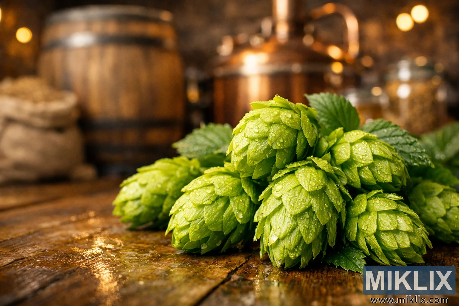 Image: Fresh Bitter Gold Hops in a Rustic Brewery Setting