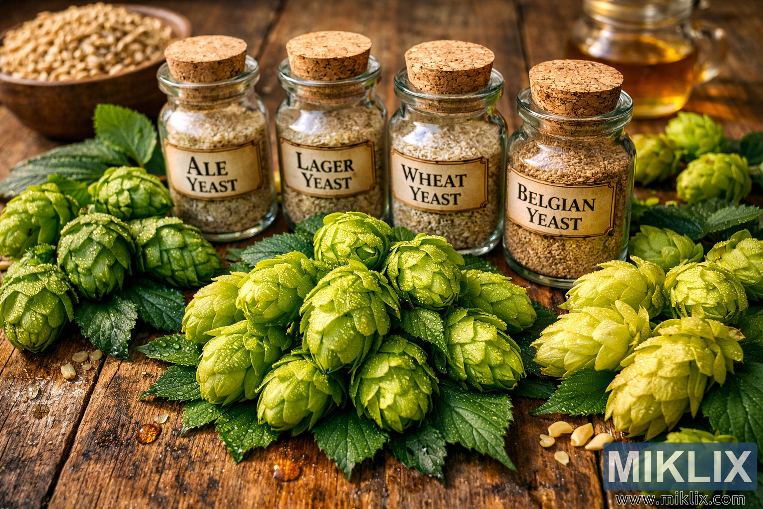Just beyond the hops, the middle ground introduces a row of artisan glass jars filled with yeast. Each jar is cylindrical, clear, and topped with a natural cork stopper, reinforcing the handcrafted, traditional aesthetic. The yeasts inside vary slightly in color and granularity, and each container bears a clearly legible label identifying its contents. The labels are designed in a classic, understated style, evoking old-world brewing traditions and careful experimentation. The glass catches the ambient light softly, producing gentle reflections without distracting from the contents.