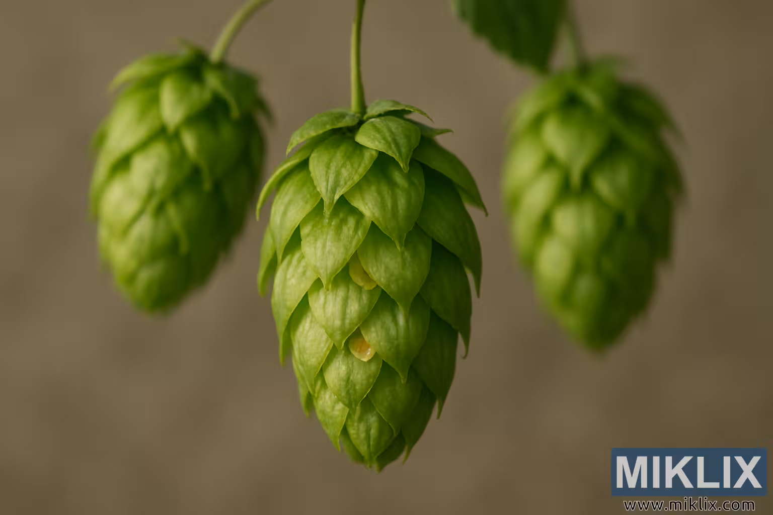 Suspended delicately against a muted, earthy backdrop, the Northern Brewer hop cones take center stage in this intimate portrait of one of brewing’s most essential ingredients. Three cones hang in focus, each at a slightly different angle, allowing the eye to appreciate the nuances of their structure. Their vibrant green tones glow softly under the influence of diffuse, natural lighting, which smooths out harsh shadows and accentuates the organic, layered pattern of the papery bracts. These overlapping scales, resembling miniature leaves arranged with geometric precision, gently peel back to reveal glimpses of the golden lupulin hidden within—the precious resin that carries the oils responsible for flavor, aroma, and bitterness in beer. The cones appear almost weightless, as though floating in the air, their stems thin yet sturdy, holding them in poised suspension.