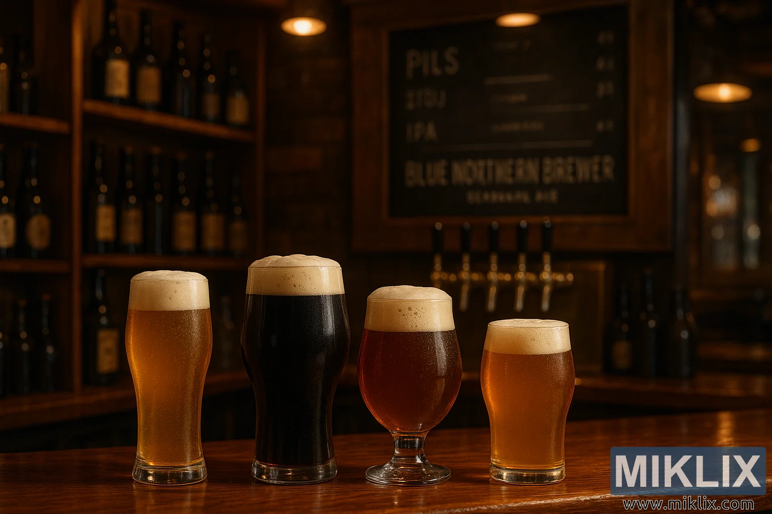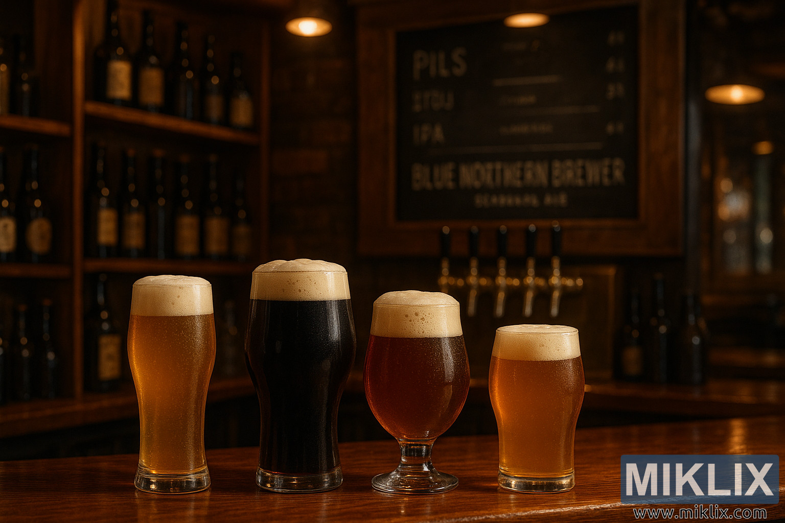 A cozy brewpub with pilsner, stout, IPA, and ale on a bar, surrounded by taps, bottles, and a chalkboard menu featuring Blue Northern Brewer seasonal ale.