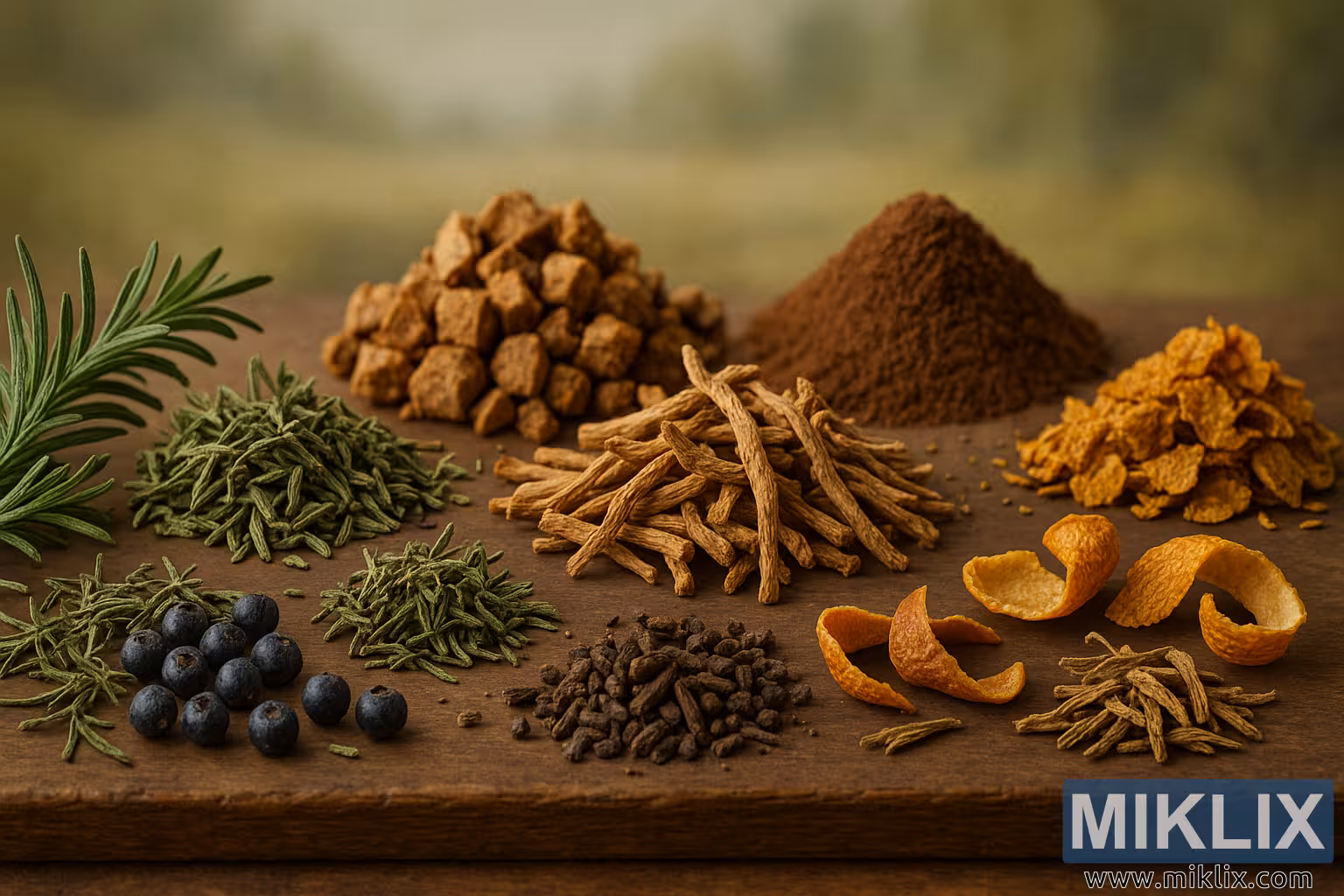 The image presents a vivid still life that feels both timeless and contemporary, a carefully staged tableau that celebrates the ingenuity of brewing traditions before and beyond the dominance of hops. At first glance, the viewer’s attention is drawn to the foreground, where an abundant collection of dried herbs, spices, and botanical treasures have been arranged with precision and artistry. Each element carries with it a unique story of flavor and aroma: rosemary with its needle-like leaves, exuding a piney sharpness; thyme with its delicate sprigs, whispering of earth and wood; juniper berries, dark and glistening, releasing a resinous citrus bite; and thin curls of citrus peel, bright against the more muted palette, promising flashes of zest and acidity. These ingredients lie in gentle disarray, arranged not in rigid order but in a way that feels organic and alive, as if they have just been gathered from a forager’s pouch or a brewer’s garden moments before being committed to the kettle.