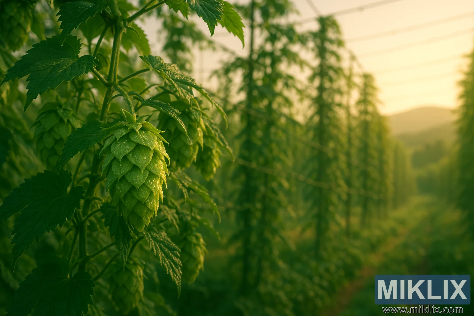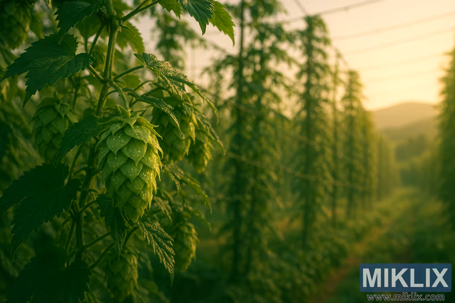 A dreamy landscape featuring Calicross hop cones glistening with morning dew, supported by trellises and bathed in golden sunlight.