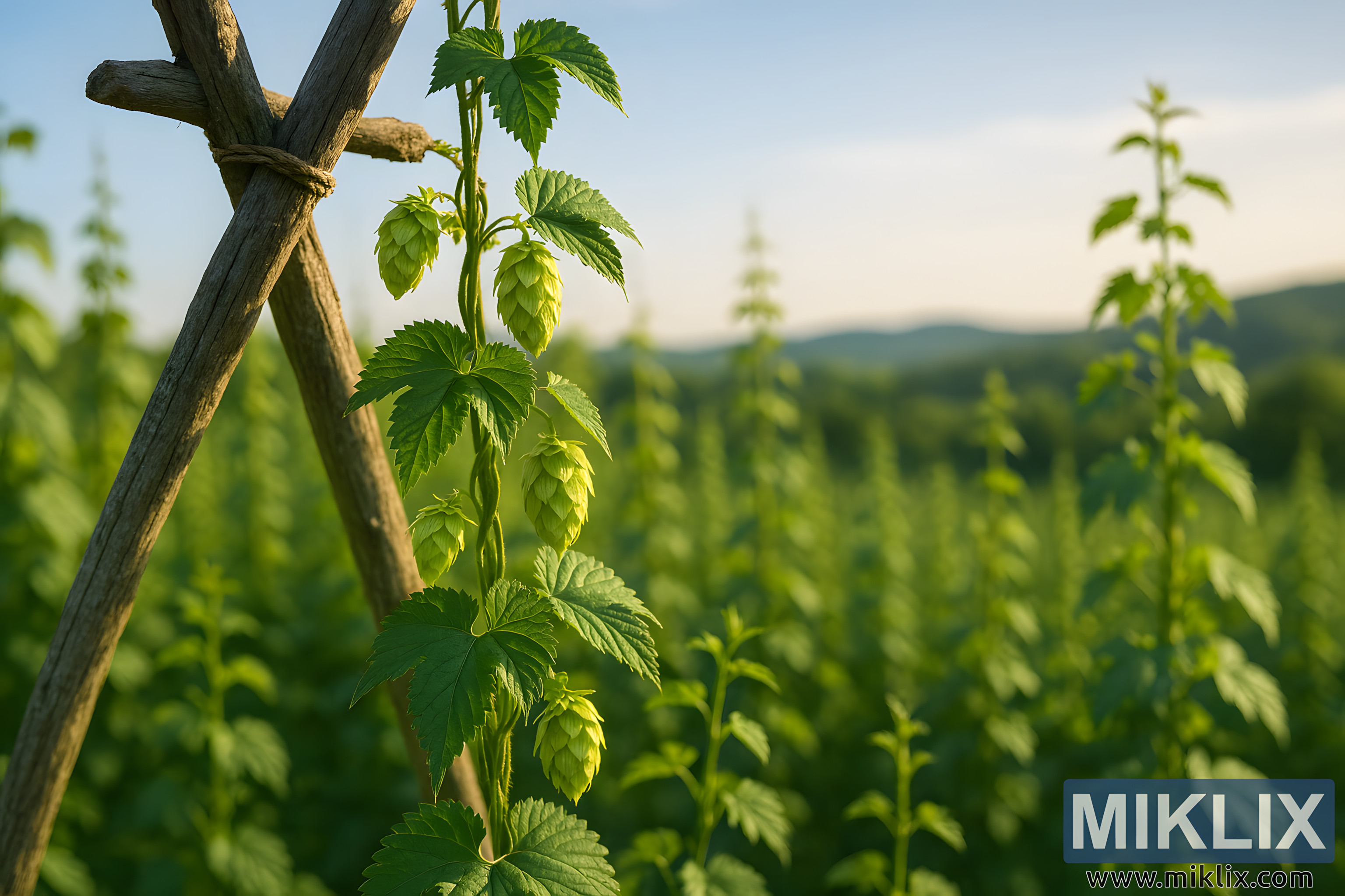 This high-resolution landscape photograph captures the serene beauty of a hop garden in early summer, with a strong focus on the Calicross hop variety (Humulus lupulus 'Calicross') climbing a rustic wooden trellis in the foreground. The trellis, constructed from weathered, rough-hewn wooden poles tied together with natural twine, stands prominently on the left side of the frame. The Calicross hops display vibrant green leaves with serrated edges and prominent venation, arranged in an alternating pattern along the climbing vine. Conical hop cones emerge from the vine, their papery bracts overlapping in intricate layers, showcasing various stages of development from tightly closed buds to fuller, mature cones.