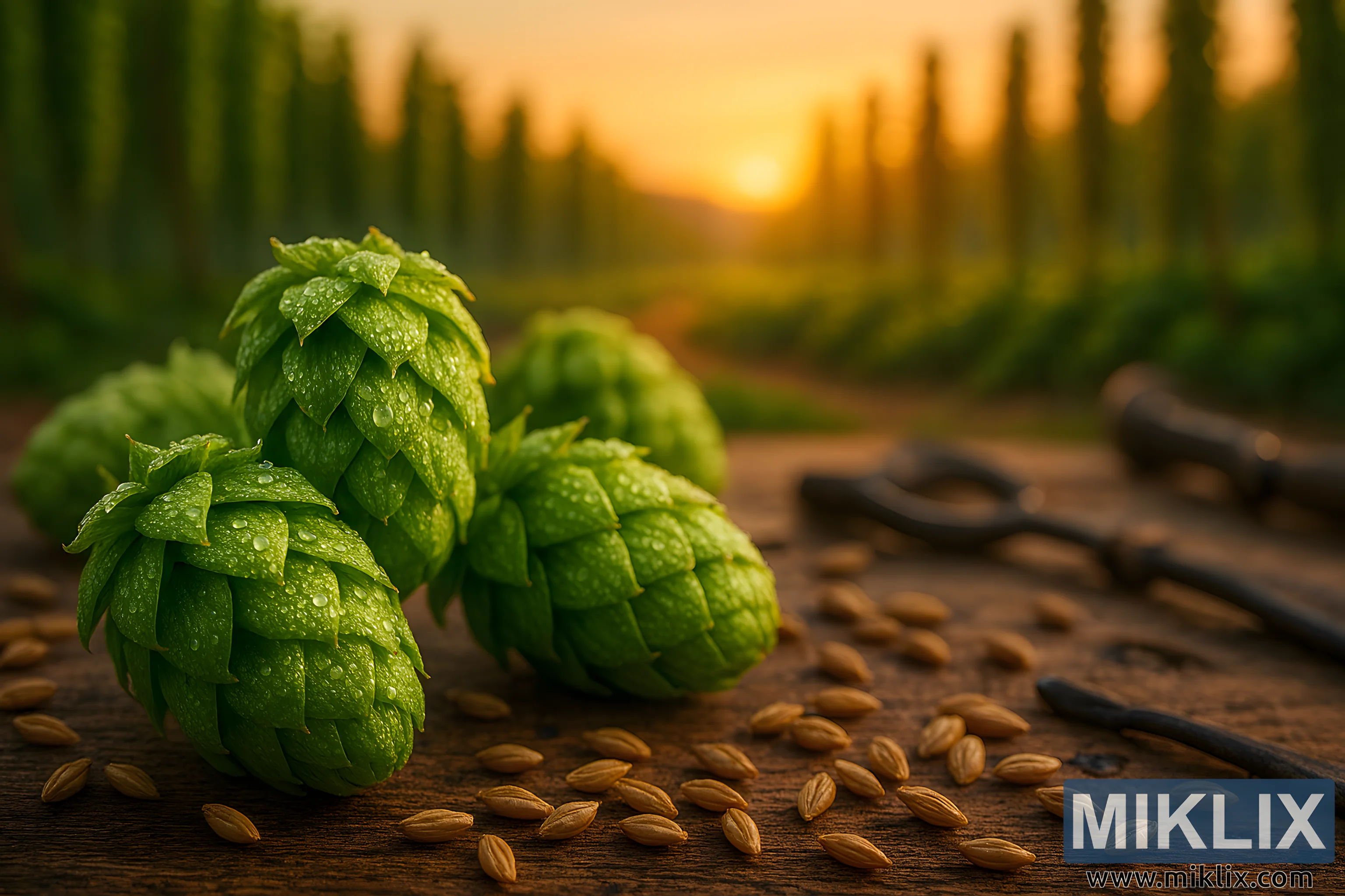 A richly detailed image of freshly harvested Calicross hops with dewdrops, barley grains, and brewing tools on a rustic table, framed by a golden sunset over a hop field.