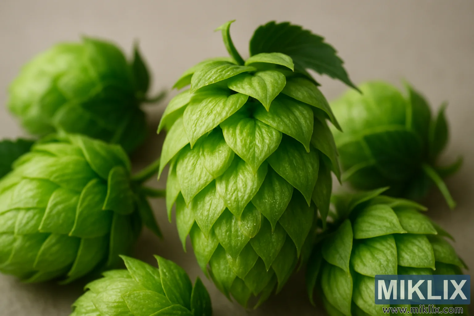 The photograph offers an intimate portrait of freshly harvested California Cluster hop cones, placing their natural beauty and brewing significance in sharp relief. In the foreground, a single cone stands proudly at the center of the composition, its layers of papery bracts overlapping in a flawless spiral that speaks of both function and elegance. Each scale is vibrant and firm, a rich green that suggests freshness and vitality, while their edges catch the soft, diffused light that falls gently across the frame. This careful lighting draws attention to the subtle variations in tone—bright lime at the edges, deepening into darker greens toward the shadows—emphasizing the complexity of the structure. The texture appears almost velvety, with a faint sheen that hints at the lupulin hidden within, the golden powder that is the true treasure of every hop cone.