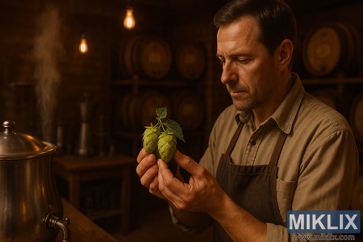 A brewmaster examines Cluster hops in a warm-lit brewery with brew kettle, tools, and oak barrels, showcasing tradition and craft in brewing with hops.