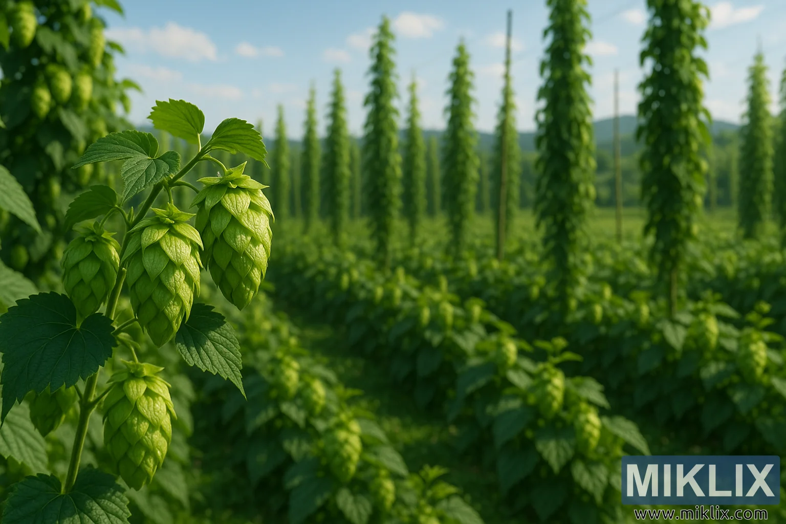 Extending beyond this immediate detail, the middle ground unfolds into orderly rows of towering hop bines, each clinging to trellises that stretch skyward like natural pillars. These plants, trained with precision and care, climb with relentless vigor, their vertical ascent a testament to both nature’s resilience and the grower’s expertise. The alignment of the rows creates a sense of rhythm and geometry, leading the eye deeper into the scene, where the repetition of green walls becomes almost hypnotic. Each bine is thick with foliage, heavy with clusters of cones that sway in the soft breeze, hinting at the quiet movement of air through the field and the rustling symphony of leaves that accompanies it. This perspective underscores the scale of the hop farm, a landscape that feels both vast and intimate, cultivated with sustainable practices that honor the land’s capacity to provide season after season.