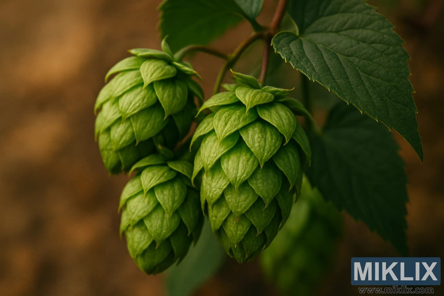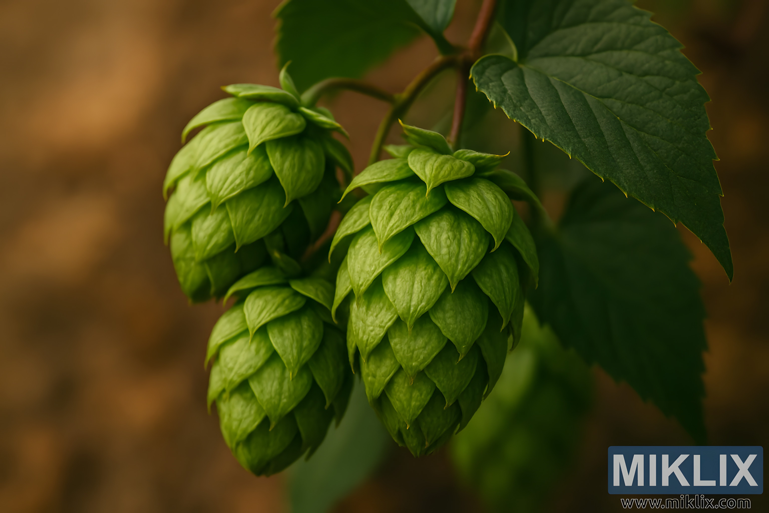 Altogether, the photograph exudes a sense of artisanal authenticity and natural abundance. It celebrates the humble yet intricate beauty of the hop cone—a vital ingredient in brewing—by isolating and elevating it as an object of aesthetic fascination. The viewer is left with a vivid impression of living plant life at its peak: vigorous, flavorful, and brimming with the promise of the beers it will someday help create.