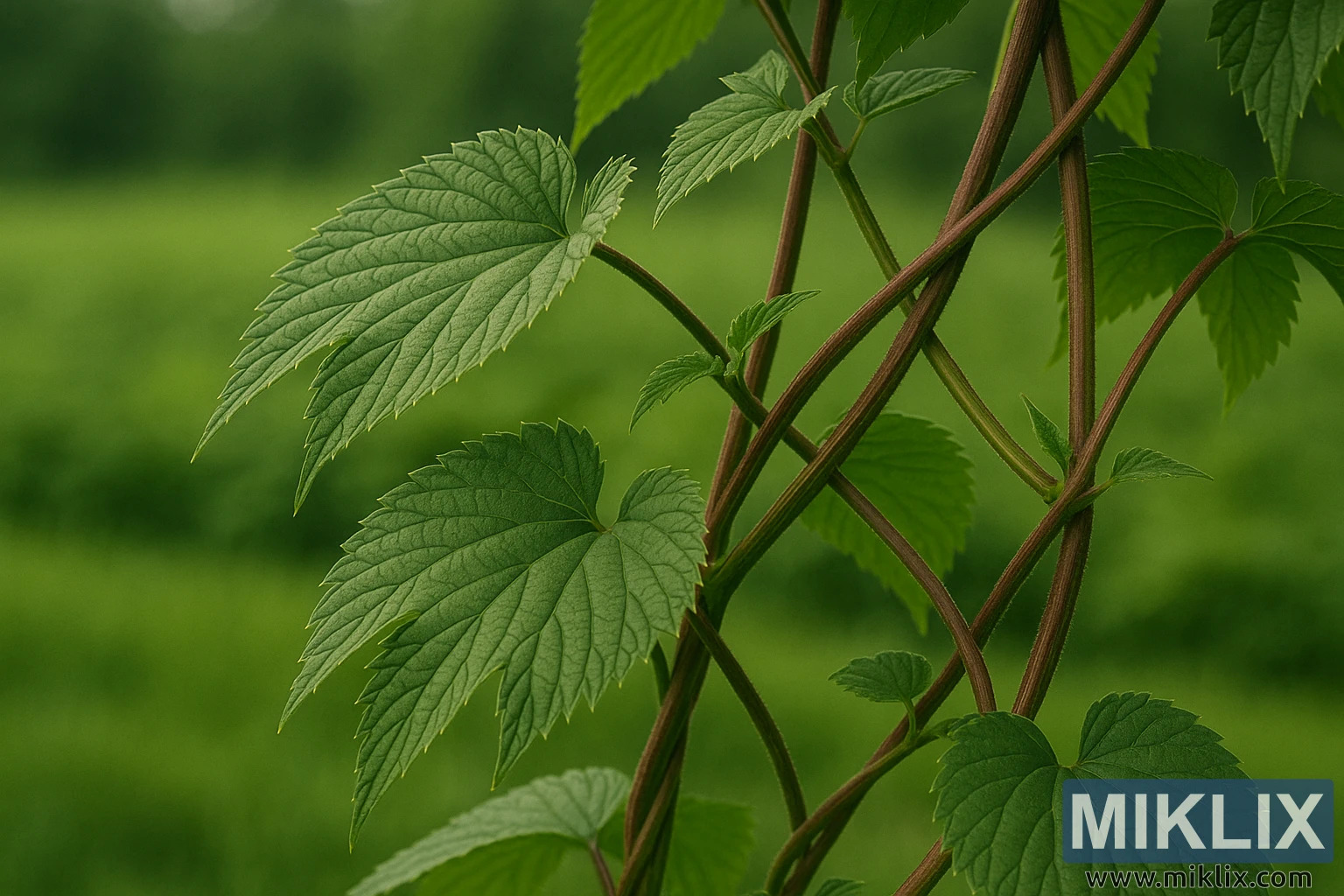 A vivid macro of Canadian Redvine hop leaves with serrated edges and reddish climbing bines against a softly blurred green field.
