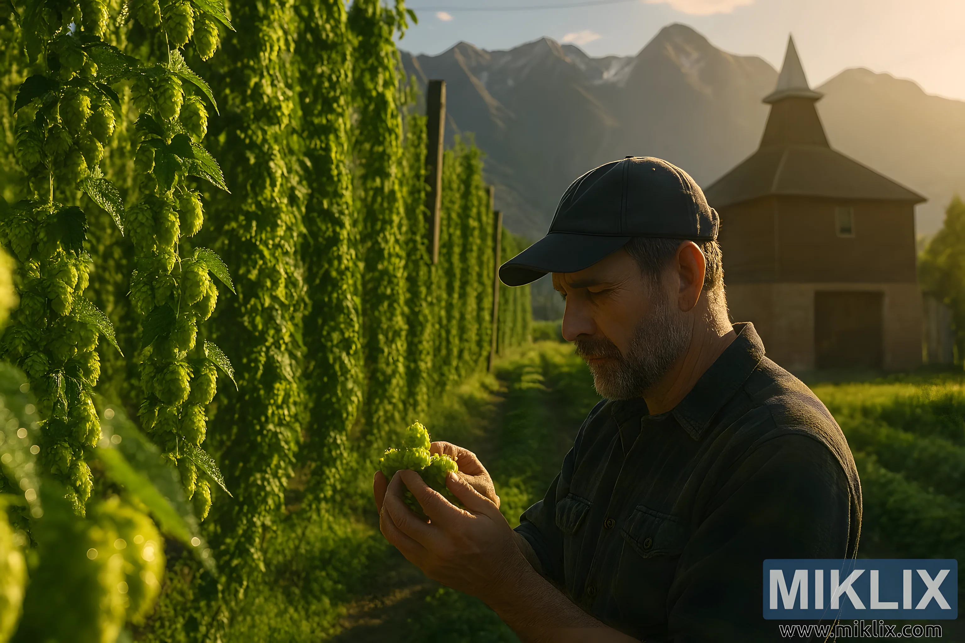 Atmospherically, the image evokes a sense of calm and purpose. The air is likely filled with the resinous aroma of fresh hops, mingling with the scent of sun-warmed earth and distant pine. The breeze rustles the leaves, and the occasional chirp of birds punctuates the quiet. It’s a moment suspended in time—where nature, tradition, and human skill converge.
