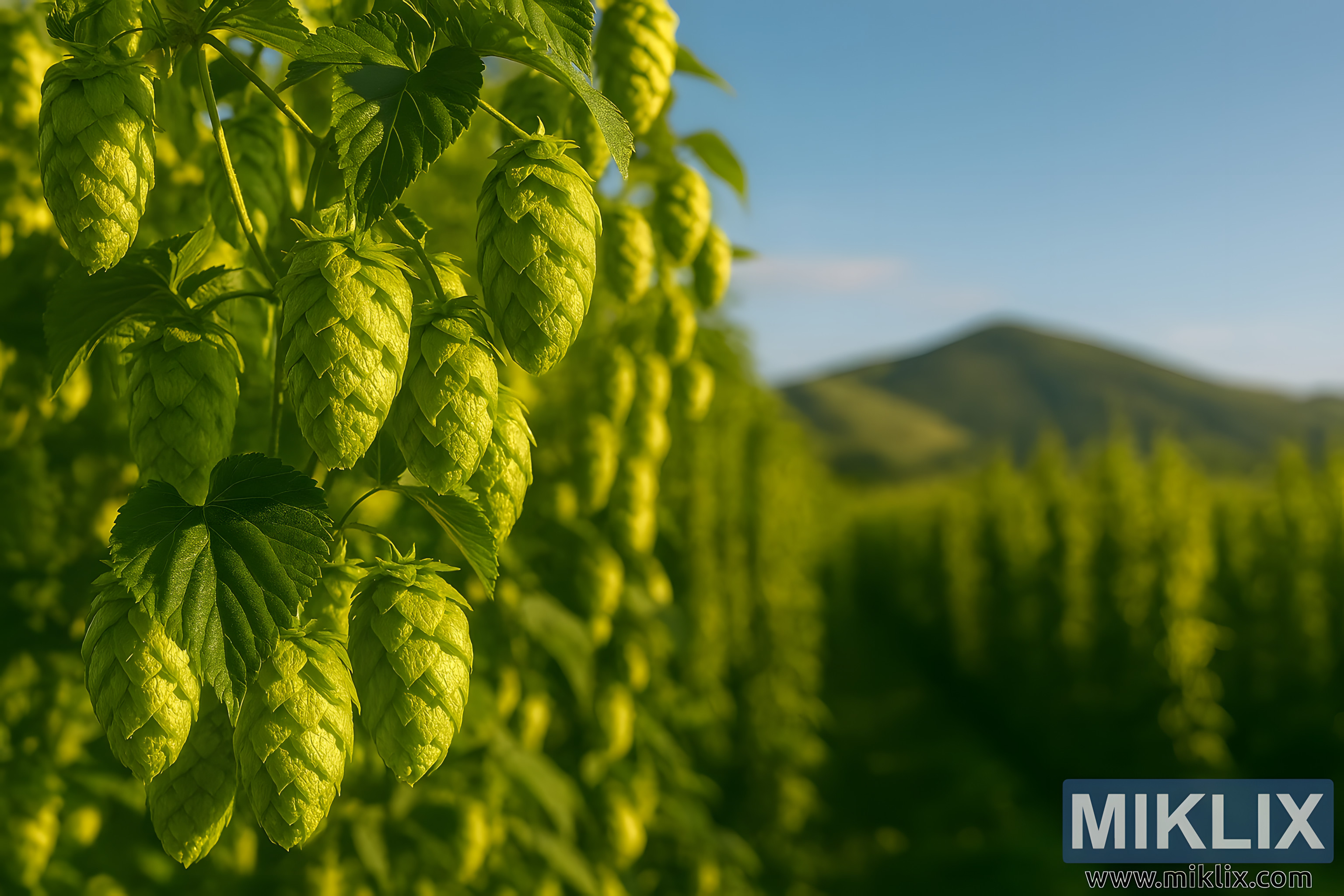 A tranquil hop field bathed in golden light showcases fragrant cones and rolling hills under a clear blue sky—an ode to nature and brewing tradition.