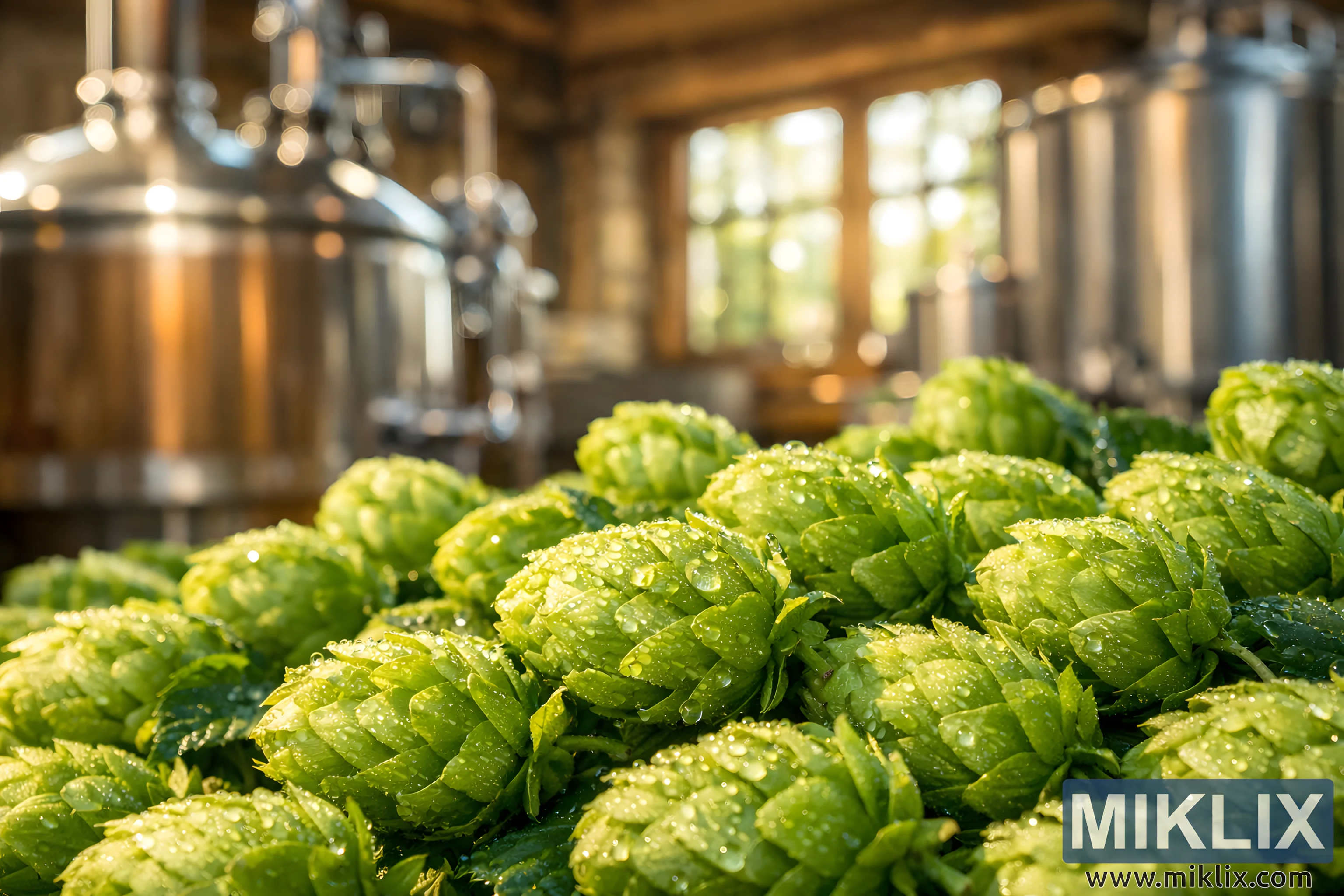 High-resolution image of freshly harvested hops with dew, captured in a rustic brewery environment with brewing equipment and warm natural light, highlighting freshness, texture, and professional beer production.