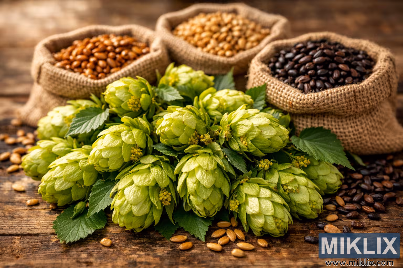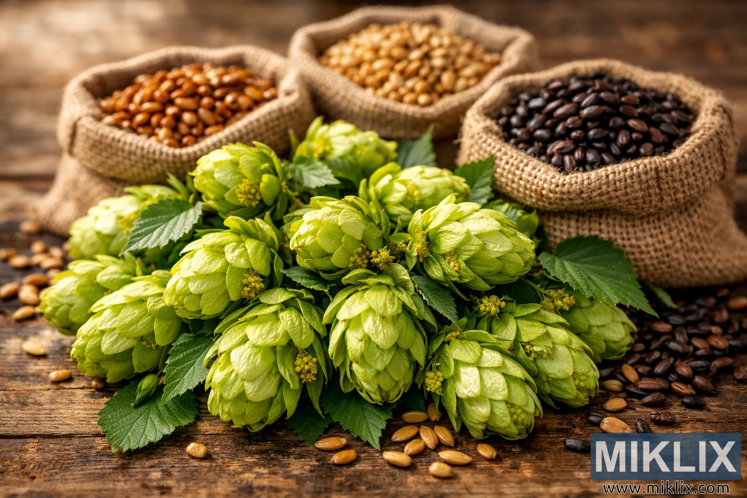 The image presents a meticulously styled flat lay composition that celebrates the raw ingredients and tactile beauty of traditional beer brewing. Dominating the foreground is a generous cluster of fresh Cluster hops, arranged loosely yet intentionally so their natural form and structure are clearly visible. The hop cones are vibrant green, layered with papery petals that curl outward, revealing subtle hints of yellow lupulin glands nestled deep within. Their surface appears resinous and slightly velvety, suggesting freshness and aromatic intensity. A few serrated hop leaves remain attached, adding variation in shape and reinforcing the just-harvested character of the hops. The macro-style perspective draws the viewer into these details, allowing the fine textures, delicate veins, and organic imperfections to stand out with striking clarity. Behind the hops, positioned in the middle ground, are several small burlap sacks filled with different types of malted grains. Each sack is open at the top, its rough woven fibers folded outward to frame the contents. The grains vary in color and tone, ranging from pale golden malts to deep amber caramel malts and nearly black roasted malts. This progression of hues creates visual rhythm and hints at the range of flavors they contribute, from sweetness and body to toasted and roasted notes. Individual kernels are scattered lightly across the wooden surface, bridging the foreground and background and adding a sense of natural abundance rather than rigid arrangement. The background consists of a rustic wooden table with visible grain lines, small cracks, and a warm, weathered patina that speaks to craftsmanship and tradition. The wood recedes into a soft blur, achieved through shallow depth of field, which enhances the sense of depth and keeps attention focused on the hops and malts. Lighting plays a crucial role in setting the mood: diffused natural light filters gently across the scene, producing soft highlights on the hop cones and subtle shadows beneath the sacks and grains. These shadows add dimension without harsh contrast, creating an inviting, warm atmosphere. Overall, the image evokes the art and ritual of brewing, blending agricultural freshness with rustic authenticity. It feels both abundant and calm, celebrating the sensory richness of hops and grains while suggesting care, patience, and the timeless craft behind beer making.
