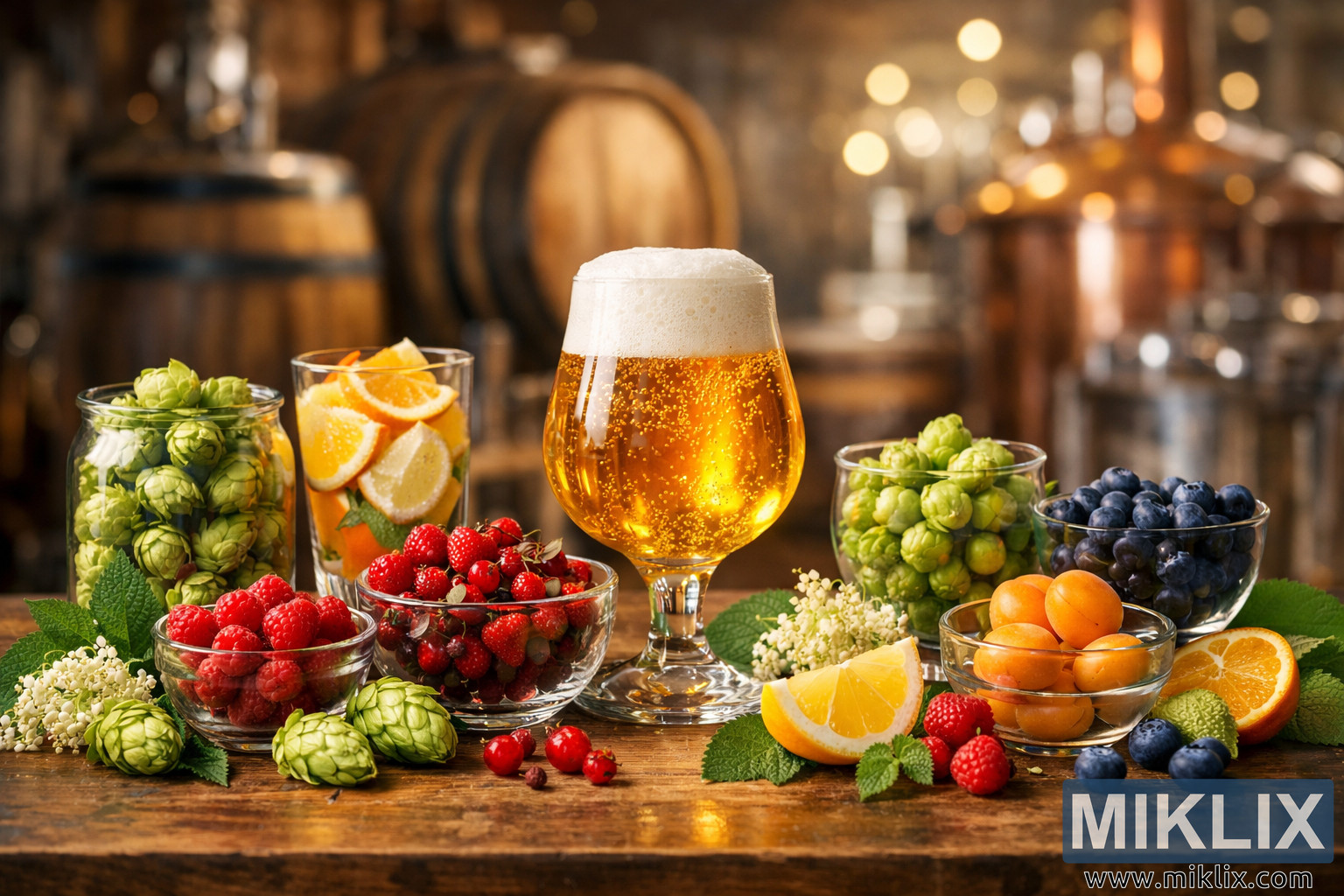 High-resolution landscape image of a lambic beer surrounded by fresh hops and colorful fruits in glass vessels, with a warm, softly blurred brewery background and inviting natural light.