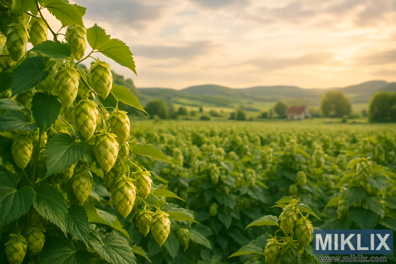 A serene countryside scene featuring vibrant green hops plants, golden-lit cones, rolling hills, and a distant farmhouse at sunset.