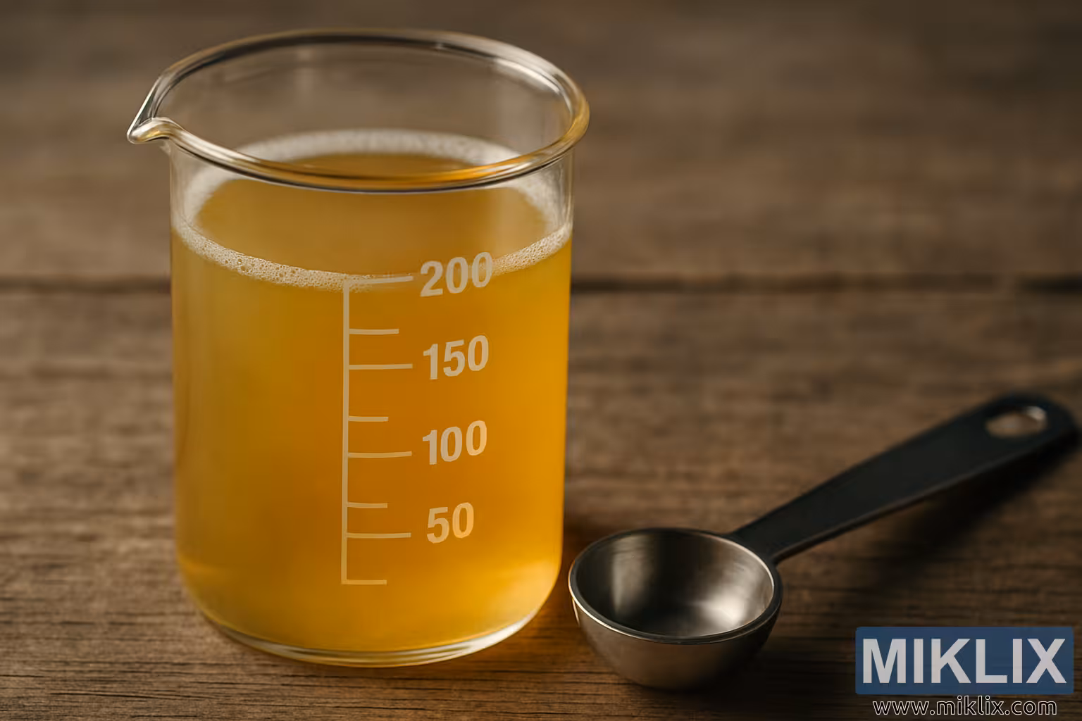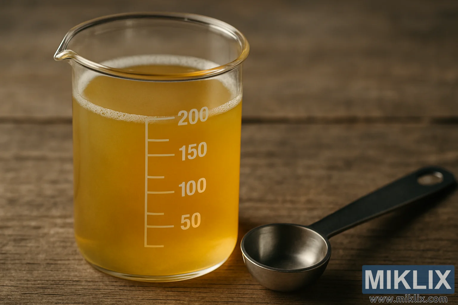 A detailed close-up image of a glass beaker containing a hazy golden liquid, accompanied by a measuring spoon on a rustic wooden surface, evoking precision and scientific craftsmanship.