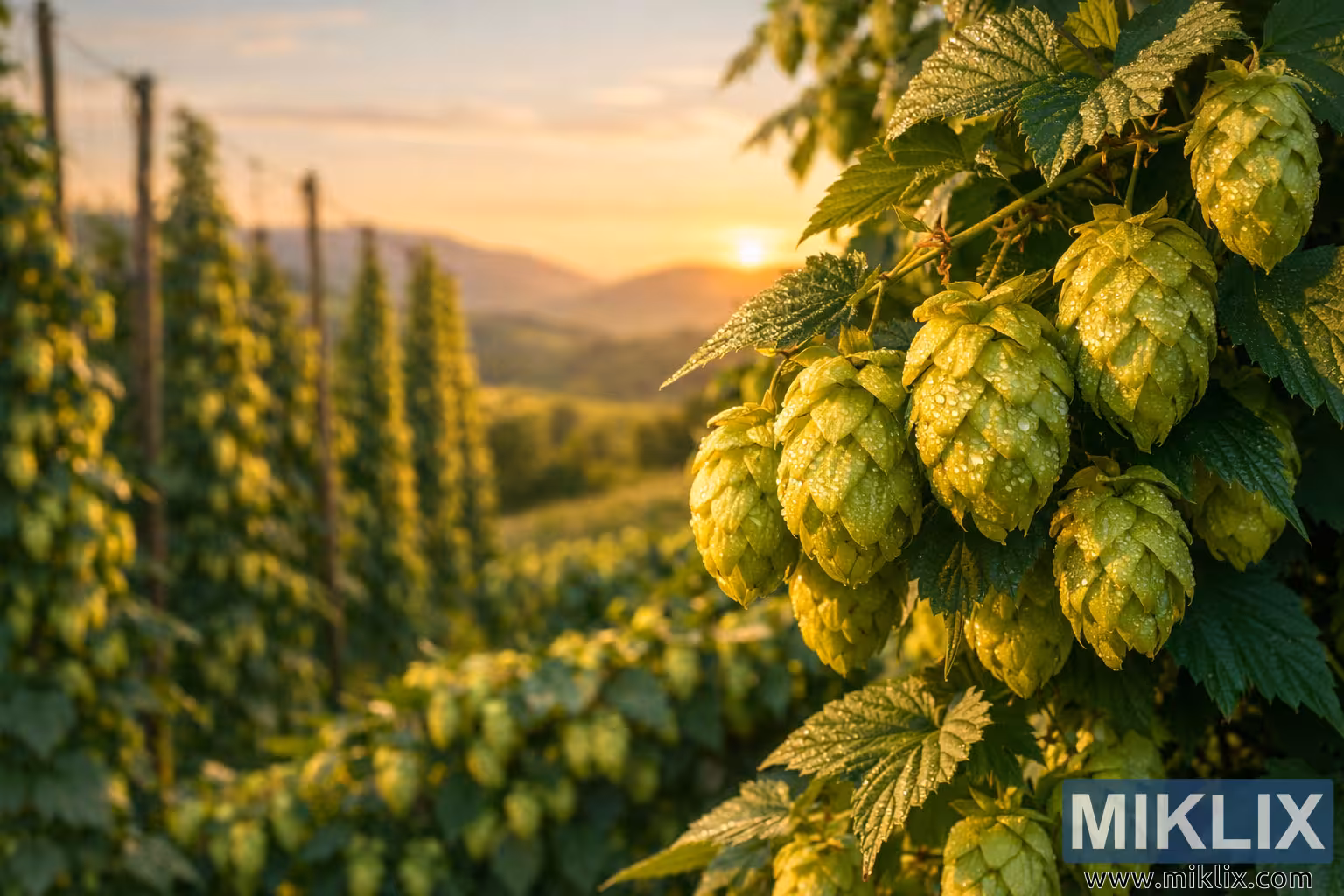 The image presents a tranquil, immersive view of a thriving hop farm captured during the golden hour, when the sun casts a warm, amber glow across the landscape. In the foreground, vibrant green hop vines dominate the composition, their broad, textured leaves appearing healthy and full of life. Hanging from the vines are clusters of plump hop cones, ranging in color from fresh green to soft golden hues. Each cone is richly detailed, with layered petals slightly open, revealing their delicate structure. Tiny droplets of moisture and natural oils glisten on the surface, catching the sunlight and suggesting the aromatic resins essential to beer brewing. The cones appear heavy and mature, gently pulled downward by their own weight, while a subtle sense of motion hints at a light breeze passing through the rows of vines. In the middle ground, the focus transitions smoothly, maintaining clarity on additional hop cones while allowing the surrounding foliage to soften. This gradual shift in depth of field enhances the tactile quality of the hops, emphasizing their freshness and readiness for harvest. The background fades into a softly blurred panorama of rolling hills and cultivated fields, creating a calm, pastoral setting. The hills are bathed in warm, diffused light, with the low sun hovering near the horizon and illuminating the scene from behind. The interplay of light and shadow adds depth and dimension, while the color palette remains harmonious, blending greens, golds, and subtle earth tones. The overall atmosphere is serene and inviting, evoking a strong connection to nature, craftsmanship, and agricultural tradition. The image conveys a sensory experience beyond sight, suggesting the earthy aroma of hops, the warmth of late afternoon sunlight, and the quiet rhythm of a working farm. It is a visual celebration of freshness, natural beauty, and the essential ingredients that form the foundation of artisanal beer brewing.