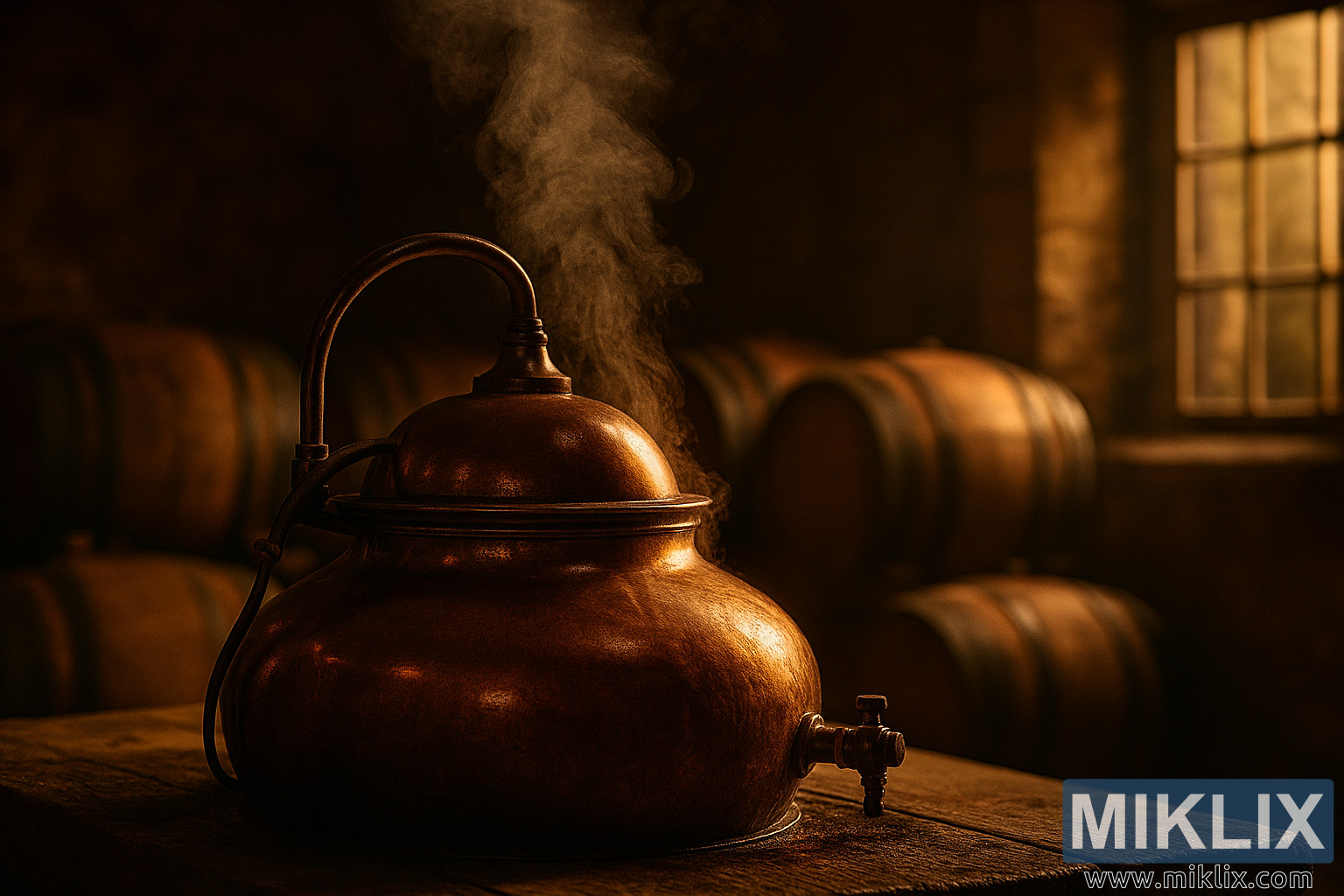 To the right, a large window with a wooden frame allows diffused sunlight to enter the space. The panes are slightly weathered, and the light they admit is soft and golden, casting long shadows and illuminating the steam, kettle, and barrels with a tranquil glow. The interplay of light and shadow adds depth and atmosphere, enhancing the sense of quiet craftsmanship.