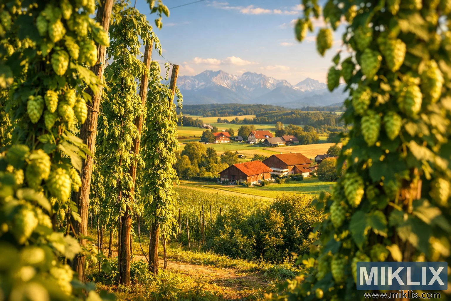 A warm, high-resolution landscape of Hallertau’s hop fields in Germany, featuring sunlit hop vines, Bavarian farmhouses, rolling hills, and majestic mountains in golden light.