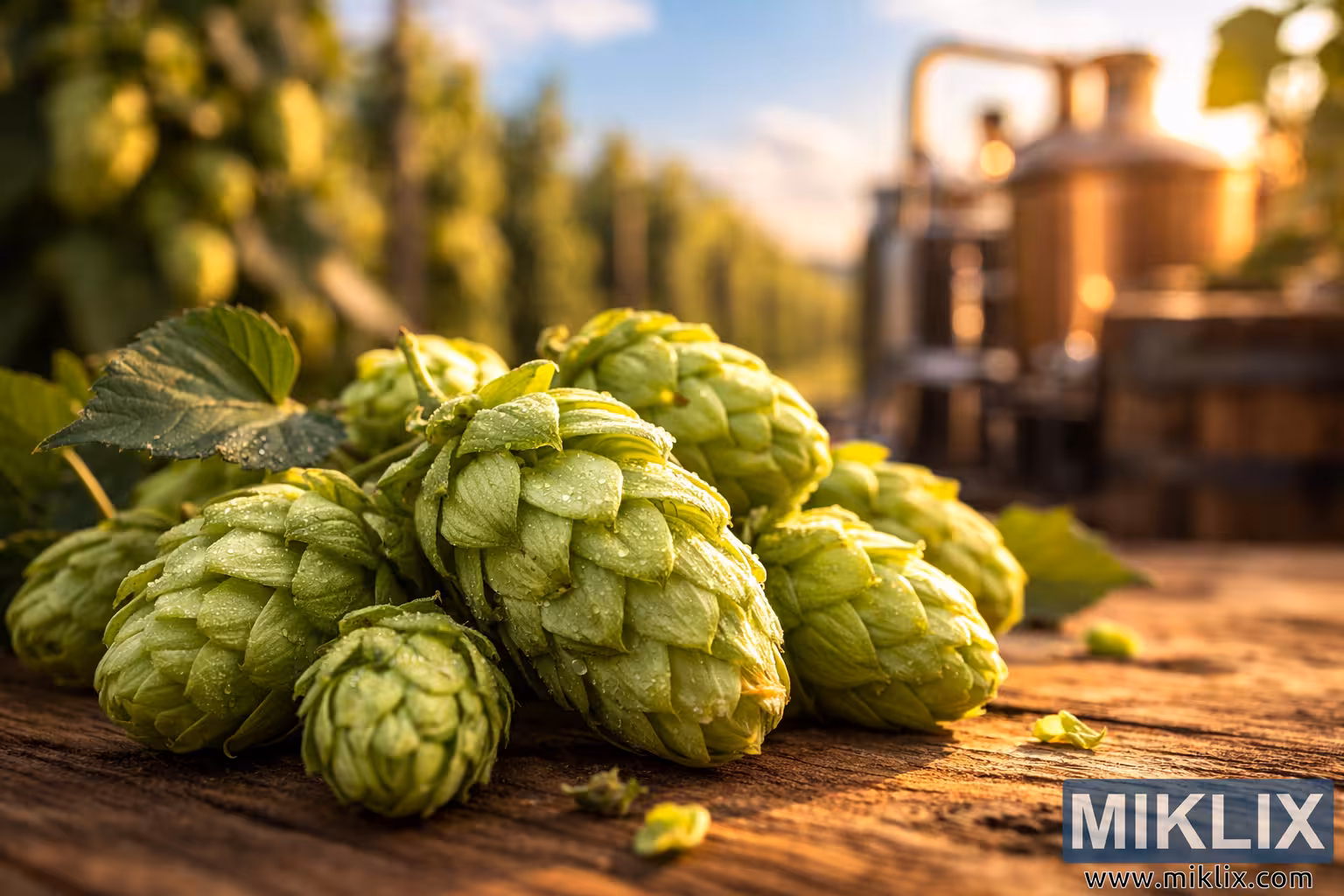 High-resolution landscape image of freshly harvested Hallertau Tradition hops in warm natural light, showcasing detailed cone texture, hop fields, and subtle brewing equipment in the background.