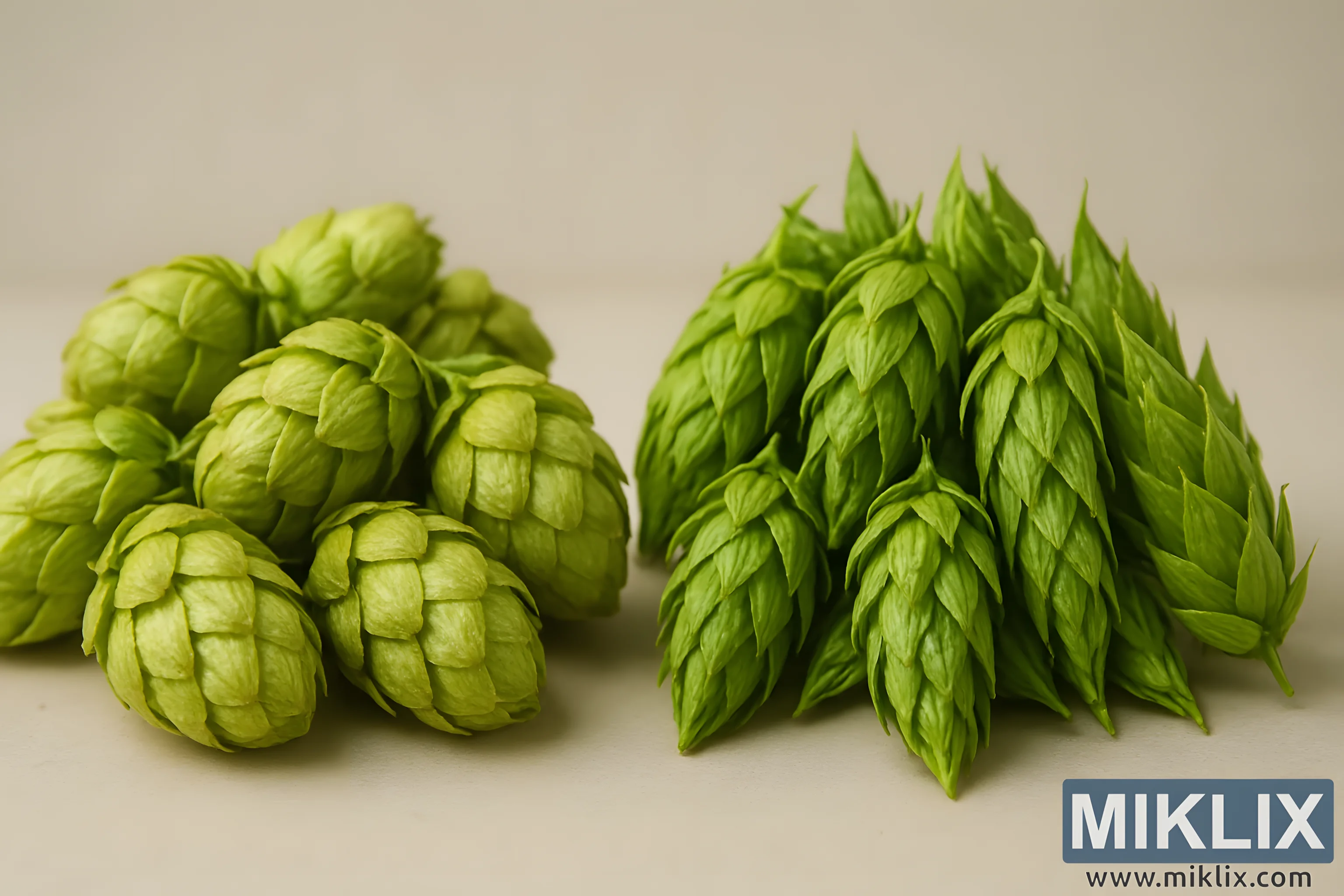 The image presents a carefully composed study in comparison, showcasing two distinct piles of freshly harvested hops placed side by side against a soft, neutral background. On the left, the classic cones of Hallertau hops sit clustered together, their golden-green bracts arranged in overlapping layers that form a plump, rounded structure. These cones possess a certain compactness, their scales tightly interwoven, giving them a solid and almost architectural appearance. Their color leans slightly toward a muted, sun-kissed green, hinting at maturity and the rich reservoir of lupulin hidden within. The papery surface of each bract catches the even lighting with a gentle sheen, suggesting their delicate yet sturdy texture, as if they could crumble softly when rubbed between the fingers, releasing their floral and spicy oils.