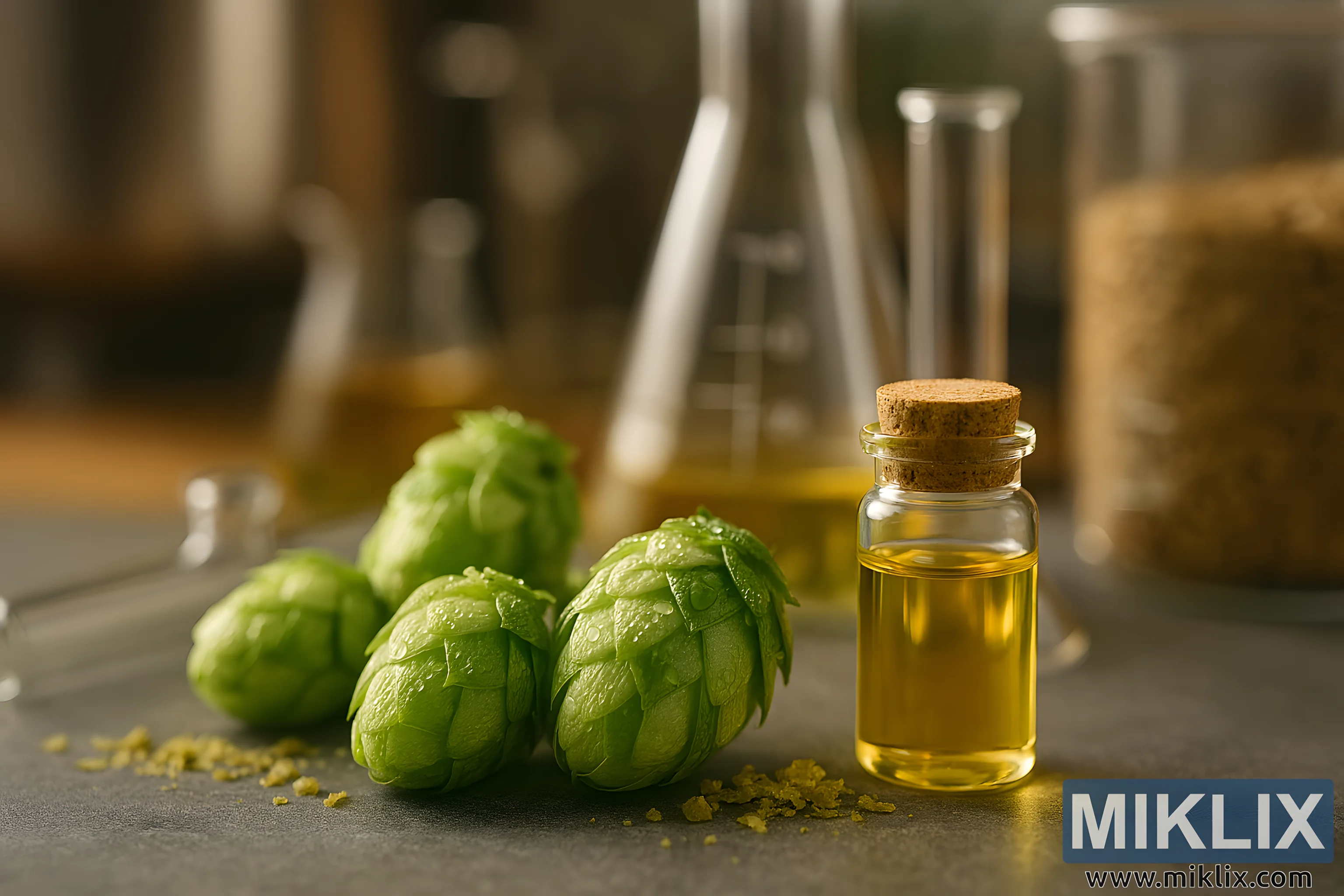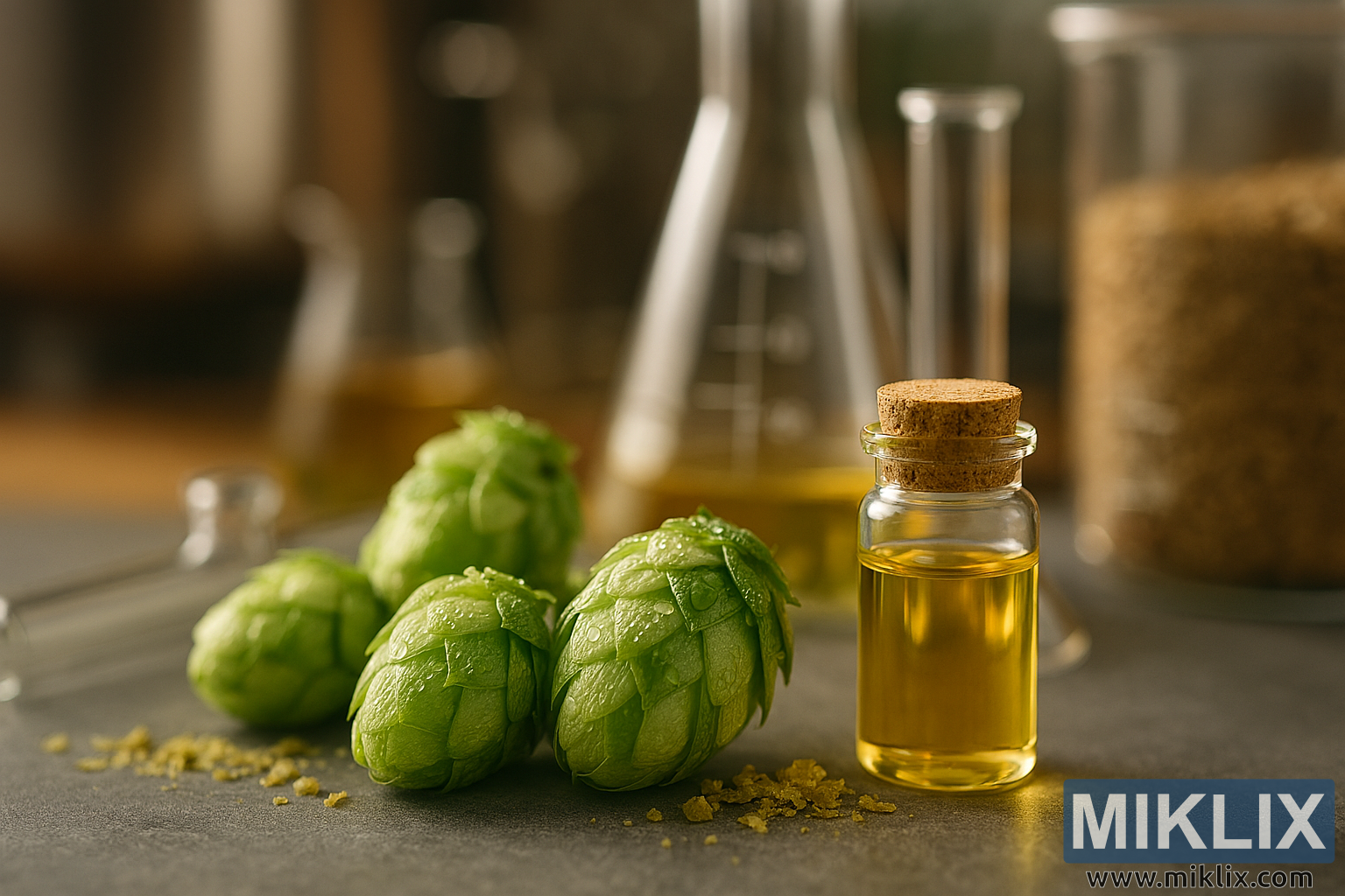A high-resolution scientific image showcasing vibrant hop cones, extracted myrcene oil, and brewing lab elements in warm natural light.