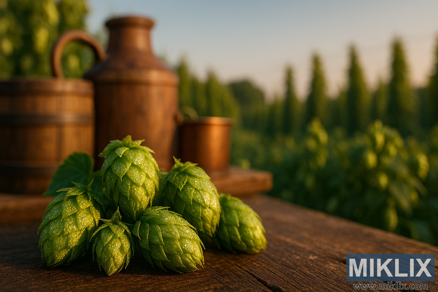 The composition employs a shallow depth of field, ensuring the hop cones in the foreground remain the focal point while the brewing setup and hop fields offer contextual depth. This technique draws the viewer’s attention to the tactile and visual qualities of the hops, emphasizing their importance in the brewing process. The interplay of light, texture, and natural elements creates a tranquil yet purposeful scene that celebrates the artistry of hop cultivation and traditional brewing.