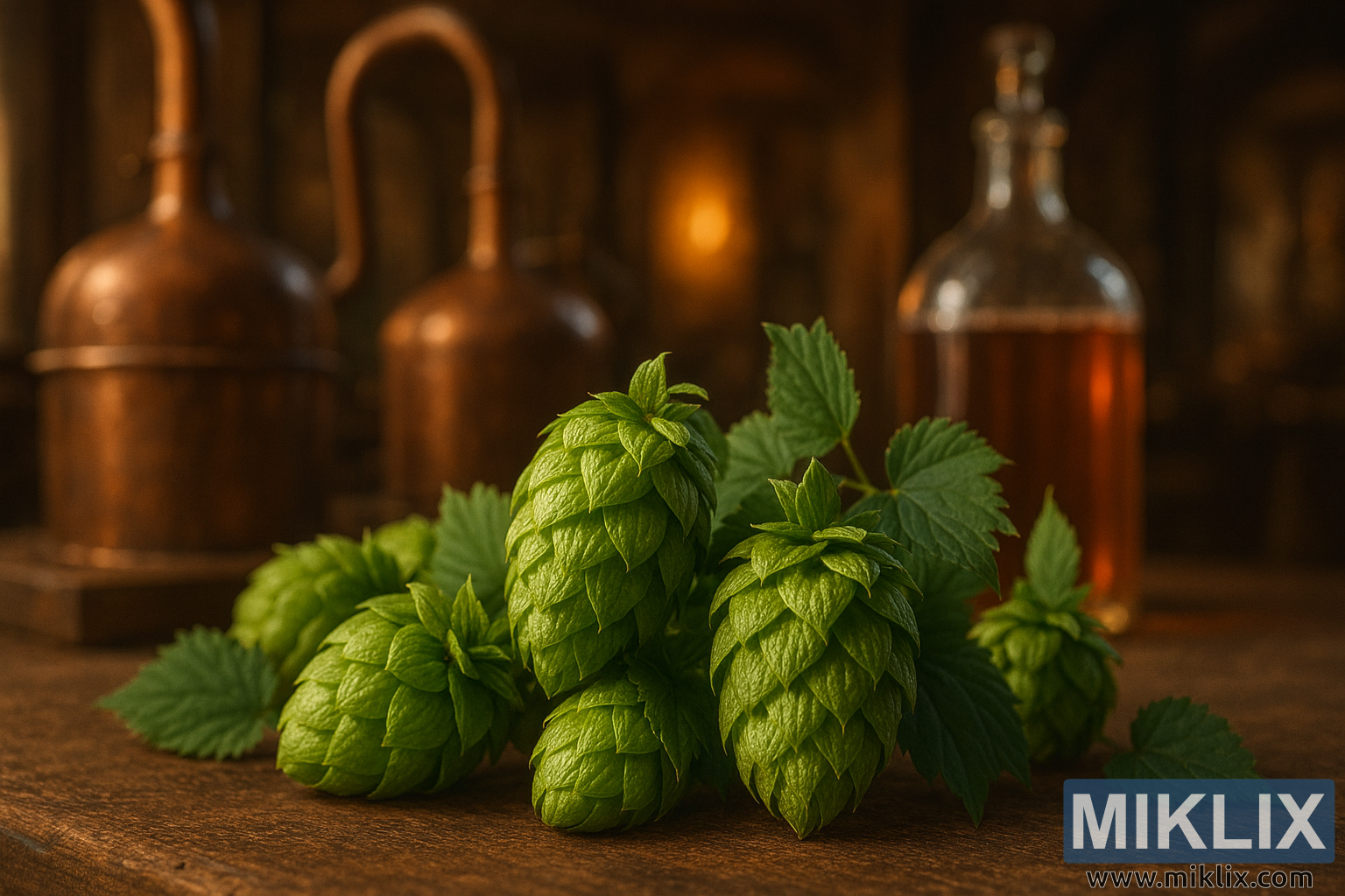 A detailed view of fresh green hops on wood with copper brewing stills and amber bottle in the background, capturing the artisanal essence of beer production.